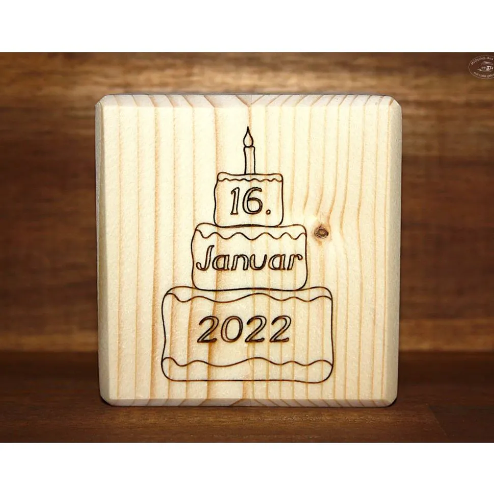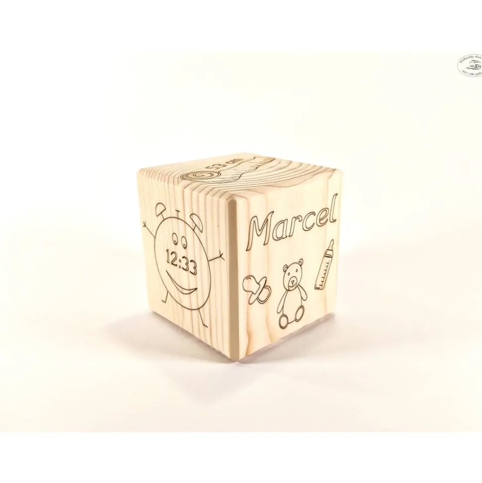 Er wurde liebevoll in Handarbeit aus dem Fichtenholz gefertigt und wird individuell personalisiert.