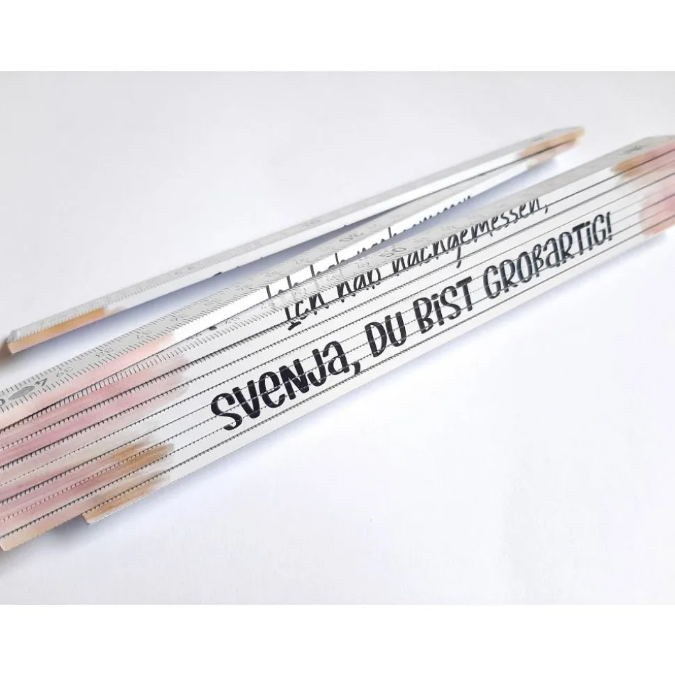 - Lieferumfang: Ein 2m Zollstock in gewünschter Farbe mit deinem persönlichen Text