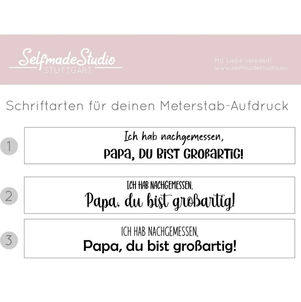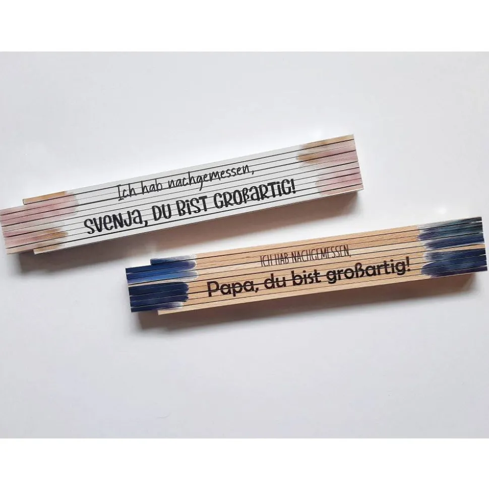 Mit dem personalisierten Meterstab mit dem Spruch „Ich hab nachgemessen – Papa du bist großartig“ zeigst du, wie sehr du Wertschätzung schätzt. Der Zollstock ist das perfekte Präsent für jeden Heimwerker, Vater, Opa oder Freund und darf in keiner Werkzeugkiste fehlen. Jeder Hobby-Handwerker freut sich, wenn das Maß stimmt – und noch mehr über deinen liebevollen Wunschtext!