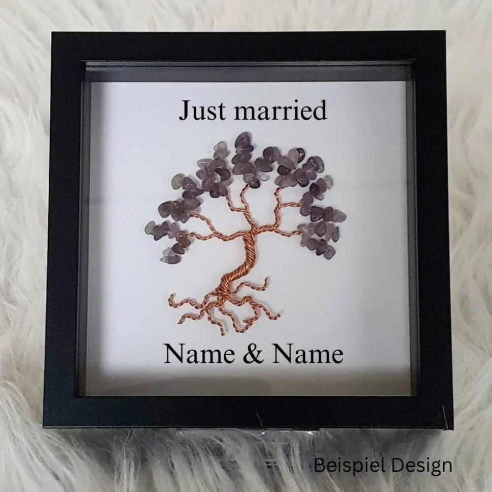 Sie können sich Ihren Edelsteinbaum ganz nach Ihren Wünschen anfertigen lassen. Da ich jeden Edelsteinbaum von Hand fertige kann ich solche Wunsch berücksichtigen. Die Bilder zeigen Ihnen wie der Edelsteinbaum ungefähr aussehen würde. Da jeder Edelsteinbaum ganz individuell gefertigt wird, sieht jeder anders aus. Für den Edelsteinbaum verwende ich fast 3 Meter Draht und zwischen 60 und 100 Edelsteinsplitter. Den ich von Hand mit speziellen Techniken biege und drahte. Um dieses Design zu fertigen. Sobald der Edelsteinbaum fertig ist wird dieser von mir in den 3D Bilderrahmen eingesetzt. Diesen können sie dann hinstellen oder anhängen.