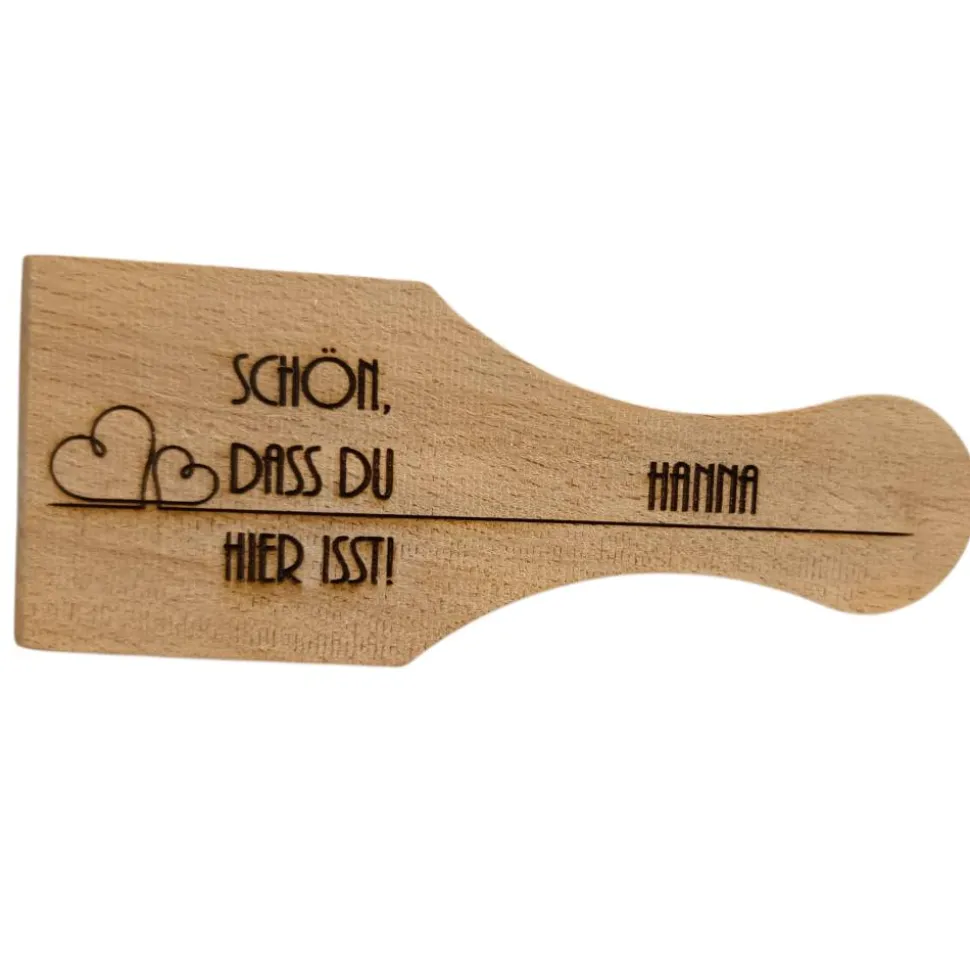 Auf Wunsch wird der Schaber zusätzlich mit einem Namen personalisiert und ersetzt so klassische Tischkärtchen auf eine nachhaltige, langlebige Art.