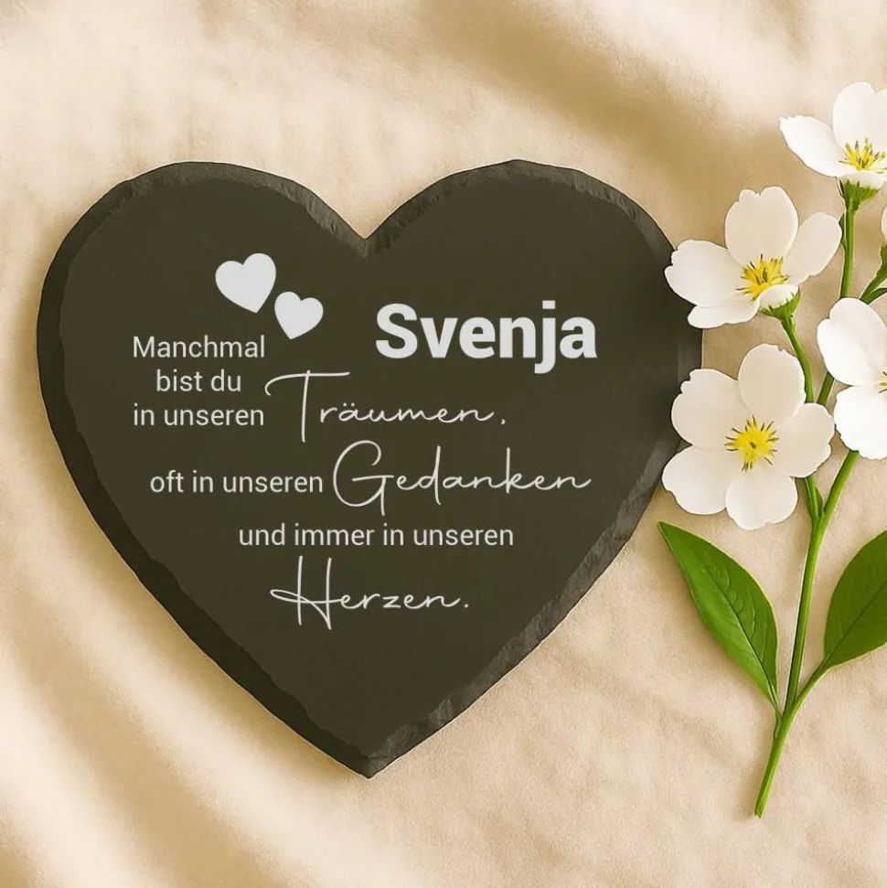Halte die Erinnerung an einen geliebten Menschen oder ein treues Tier lebendig – mit einem gravierten Schieferherz als Gedenkstein. Dieser einzigartige Grabschmuck wird individuell für dich angefertigt und mit deinem Wunschnamen sowie einem Spruch oder Motiv versehen.