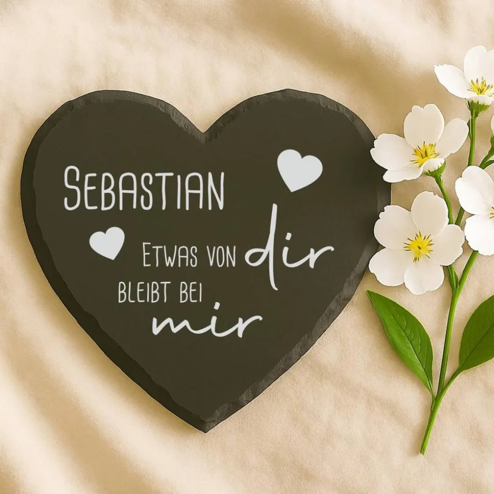 Halte die Erinnerung an einen geliebten Menschen oder ein treues Tier lebendig – mit einem gravierten Schieferherz als Gedenkstein. Dieser einzigartige Grabschmuck wird individuell für dich angefertigt und mit deinem Wunschnamen sowie einem Spruch oder Motiv versehen.