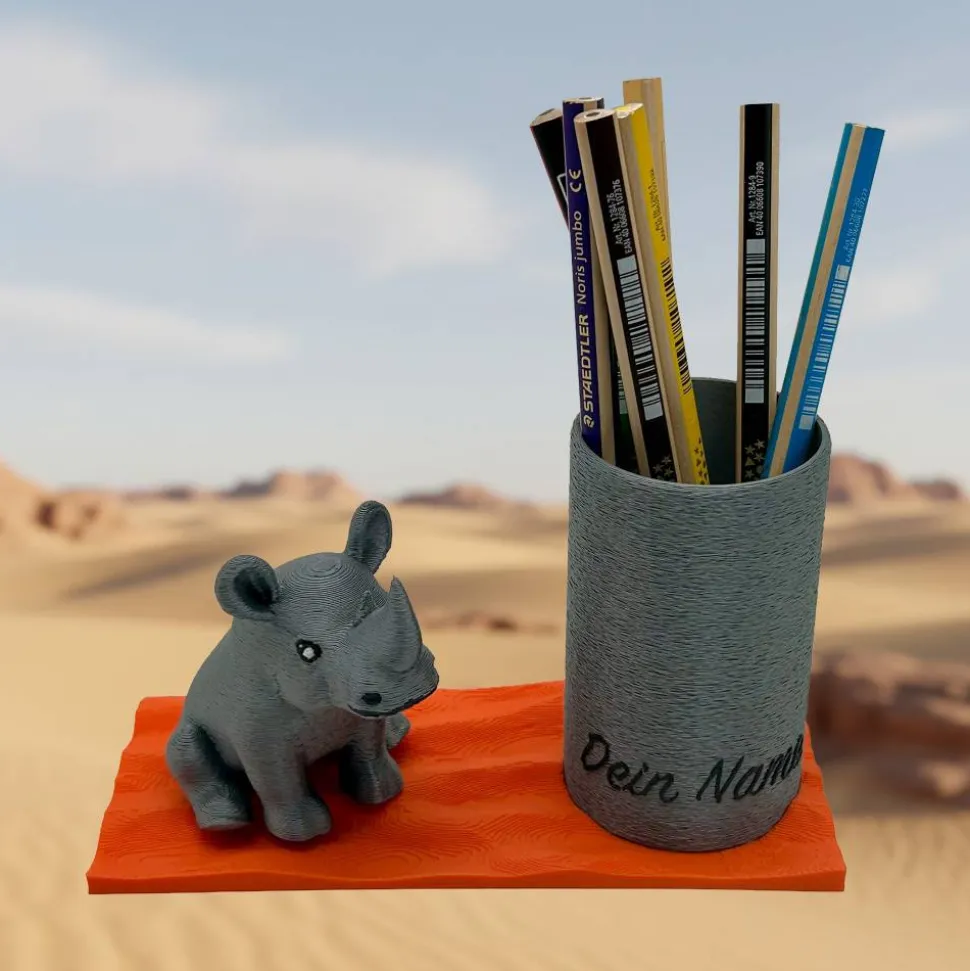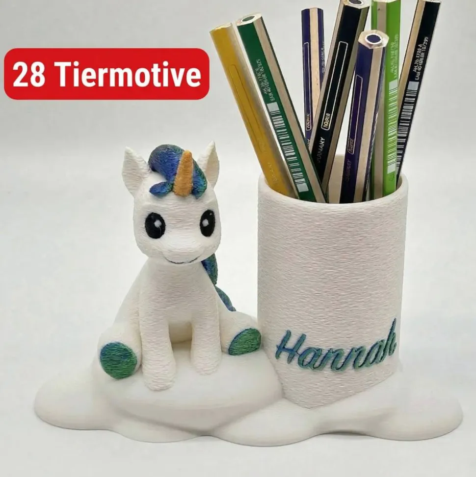 Dieser personalisierte Stiftehalter zur Einschulung bringt Ordnung auf den Schreibtisch und macht Kindern den Schulstart noch schöner. Das Tiermotiv ist frei wählbar und der Stiftehalter kann optional mit Namen personalisiert werden. So entsteht ein besonderer Schreibtisch Organizer für den ersten eigenen Lernplatz im Kinderzimmer oder ein liebevolles Geschenk für die Schultüte. Der Becher eignet sich für Buntstifte, Filzstifte, Schere oder Lineal und hilft dabei, wichtige Schulsachen griffbereit aufzubewahren. Gefertigt wird der Stiftehalter im 3D-Druck aus PLA. Die Maße betragen innen ca. 5,5 cm, komplett ca. 18 x 8 x 11 cm. Zur Auswahl stehen 28 Tiermotive, darunter Dino, Einhorn, Panda, Eule, Elefant, Koala, Katze, Hund und viele weitere.