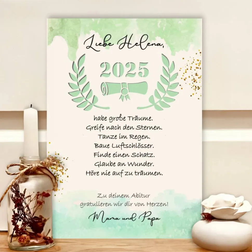 Motivierendes Design: Das stilvolle Blätter-Motiv, die Jahreszahl, eine Urkunde und der Spruch „Höre nie auf zu träumen“ machen das Geschenk zum inspirierenden Blickfang. Es motiviert für den nächsten Lebensabschnitt und bleibt auch ohne Geld ein dekorativer Hingucker.