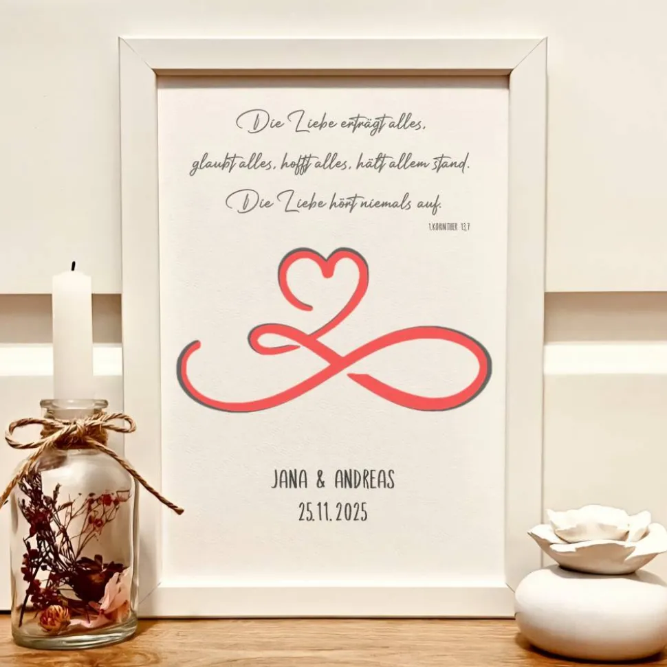 Verschenke ein einzigartiges, personalisiertes Geldgeschenk zur Hochzeit, das Liebe, Glaube und Kreativität vereint. Mit deinem Wunschname und Hochzeitsdatum personalisiert, wird dieses Andenken im A4-Bilderrahmen zu einer bleibenden Erinnerung für das Brautpaar!