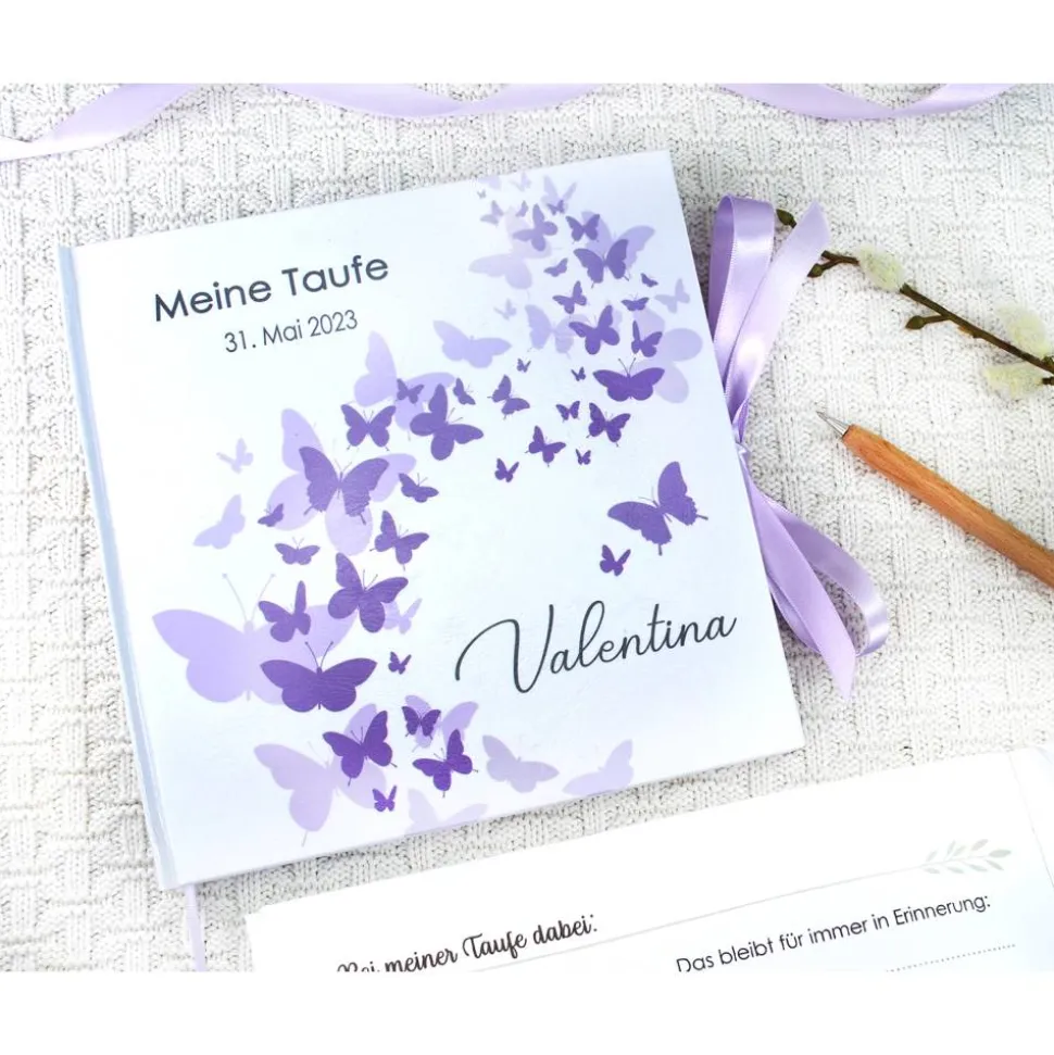 Personalisiertes Gästebuch zur Taufe mit einem Schwarm aus Schmetterlingen in Lila und Flieder für Mädchen; blanko oder mit Fragebogen für die Gäste; mit Seiten zum Ausfüllen und Selbstgestalten