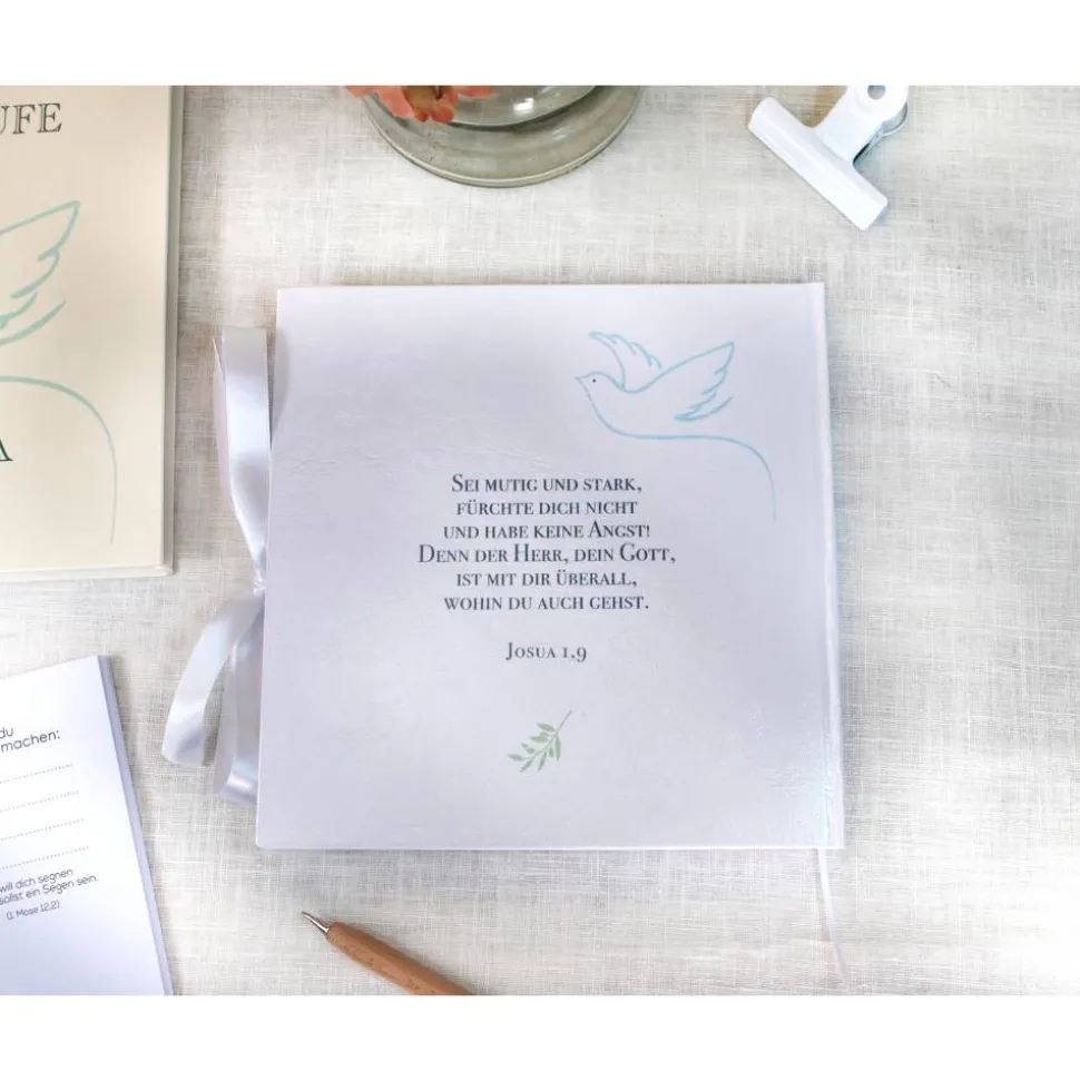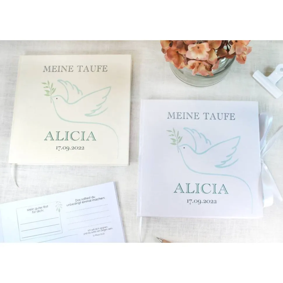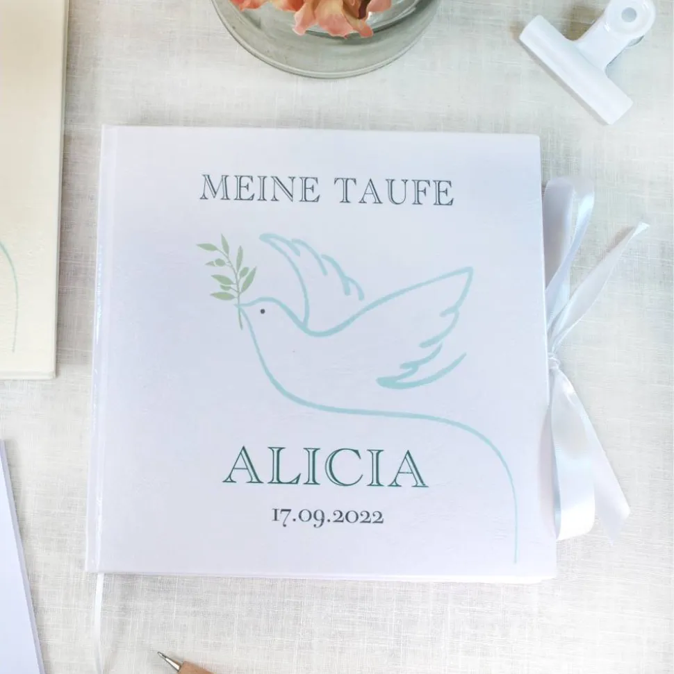 Personalisiertes Gästebuch & Taufalbum mit Taube und Olivenzweig zur Taufe mit Gästefragen oder Blanko