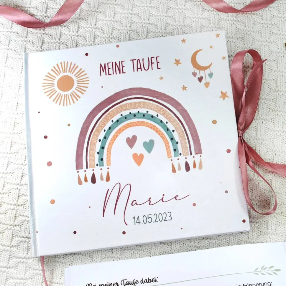 Gästebuch & Album zur Taufe mit Regenbogen, Herzen, Sonne und Mond in beerigen Pastellfarben; personalisiert mit Name, Taufspruch & Datum; zum Ausfüllen und Selbstgestalten oder mit Fragebögen für die Gäste