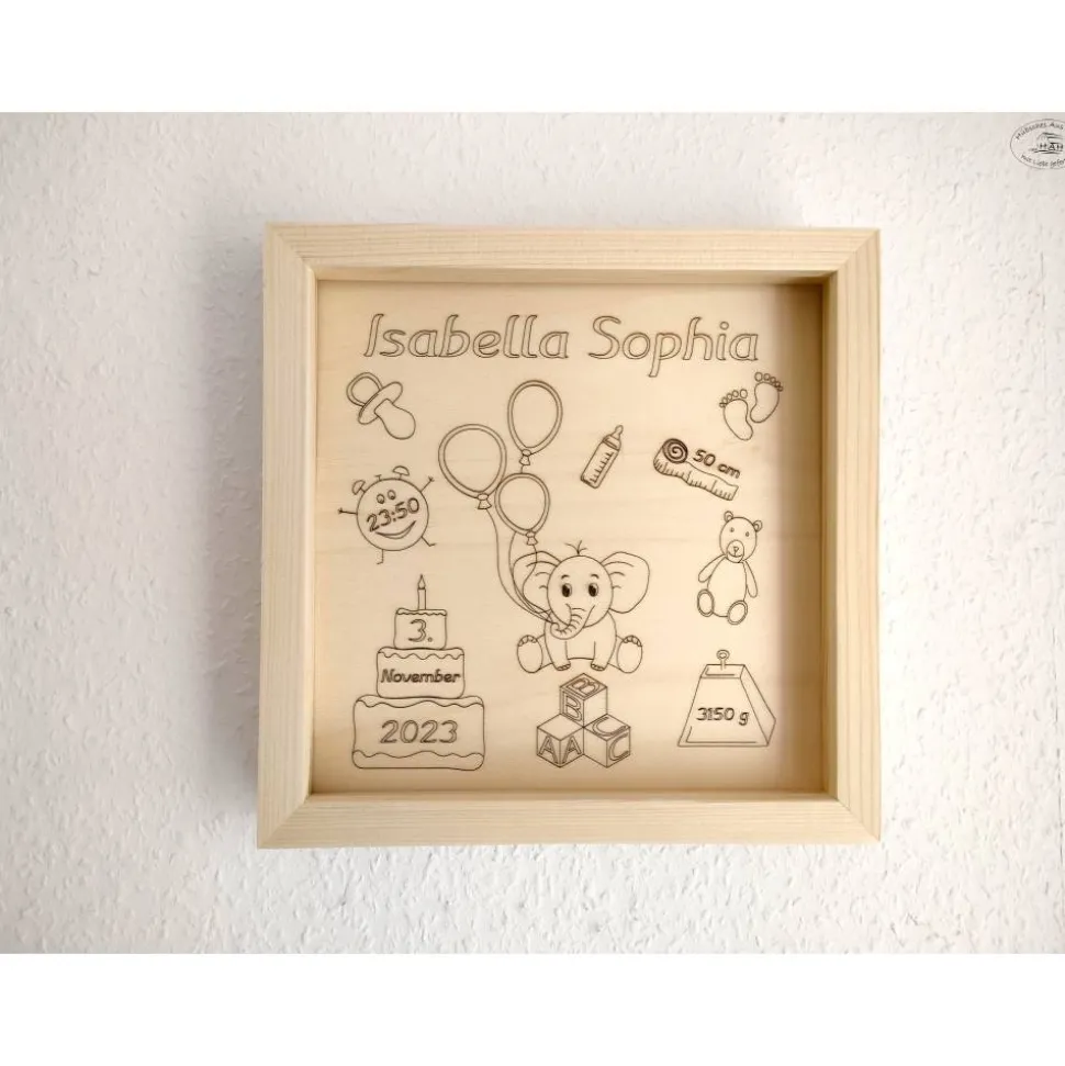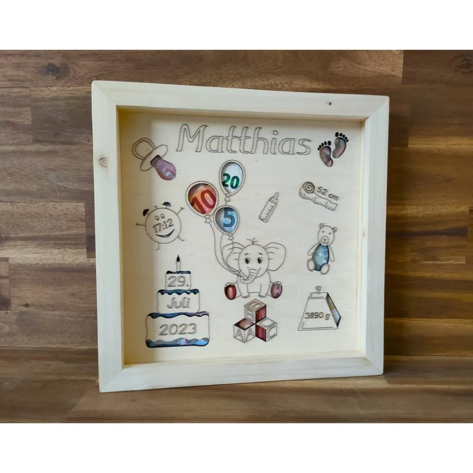 Der Bilderrahmen wurde in liebevoller Handarbeit aus Fichtenholz gefertigt. Das Inlay aus Pappelholz wird mit den Geburtsdaten des Kindes und den liebevoll entworfenen, abgebildeten Motiven graviert.