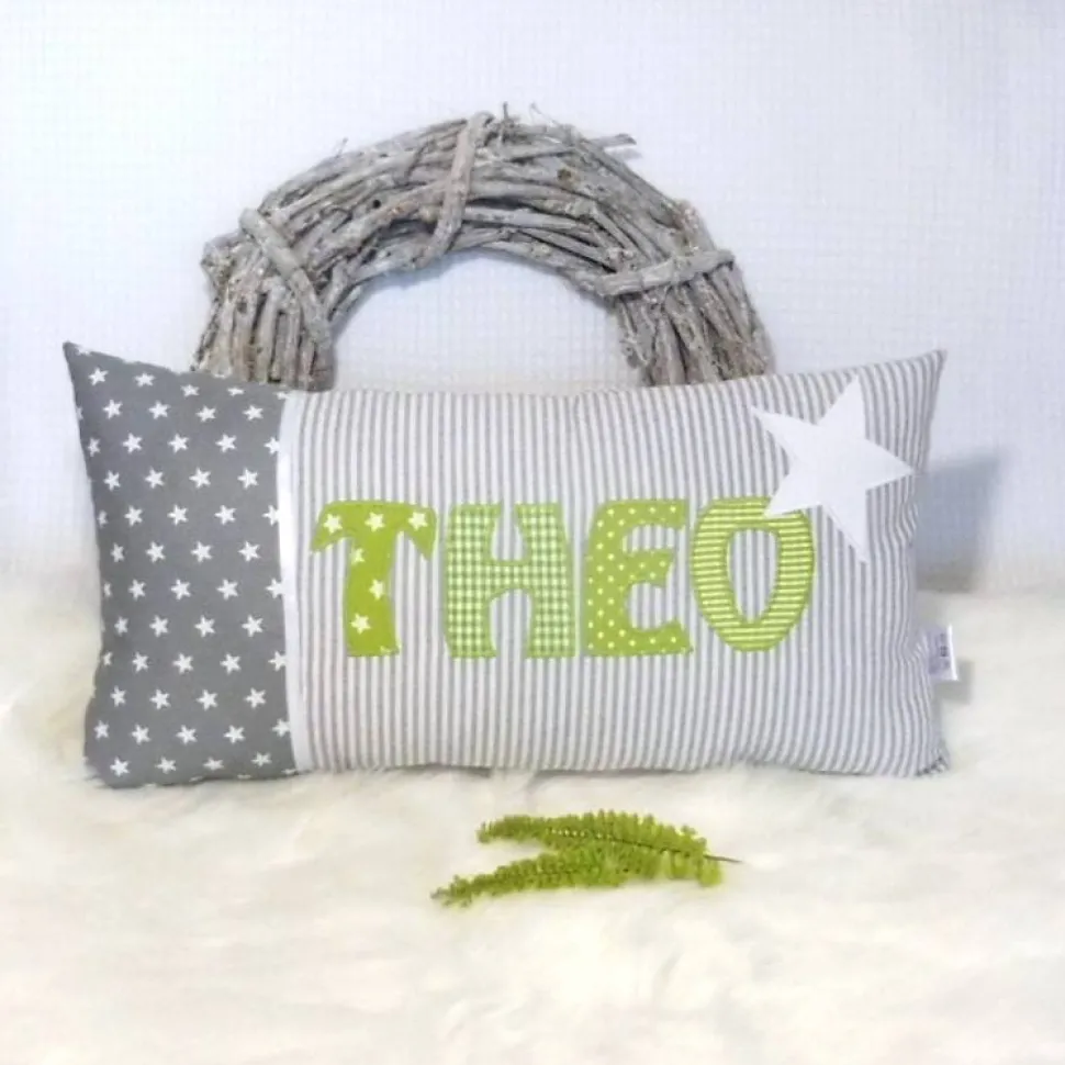 Dieses weiche Kissen (20cm x 40cm) in grau/weiß wird individuell mit dem Namen und den Geburtsdaten des Kindes bestickt. Es ist das ideale Geschenk zur Geburt oder Taufe und ein absolutes Unikat, das in Erinnerung bleibt.
