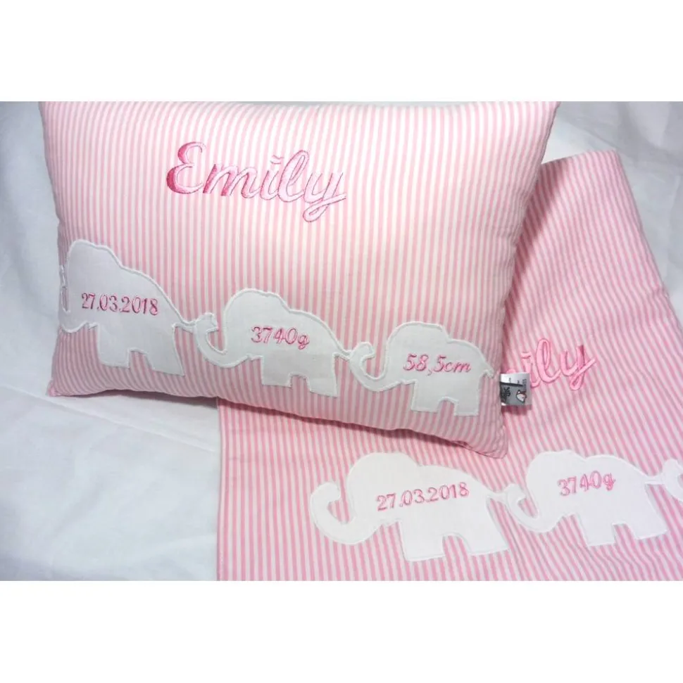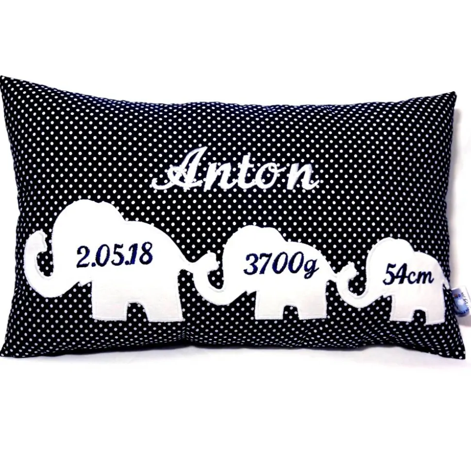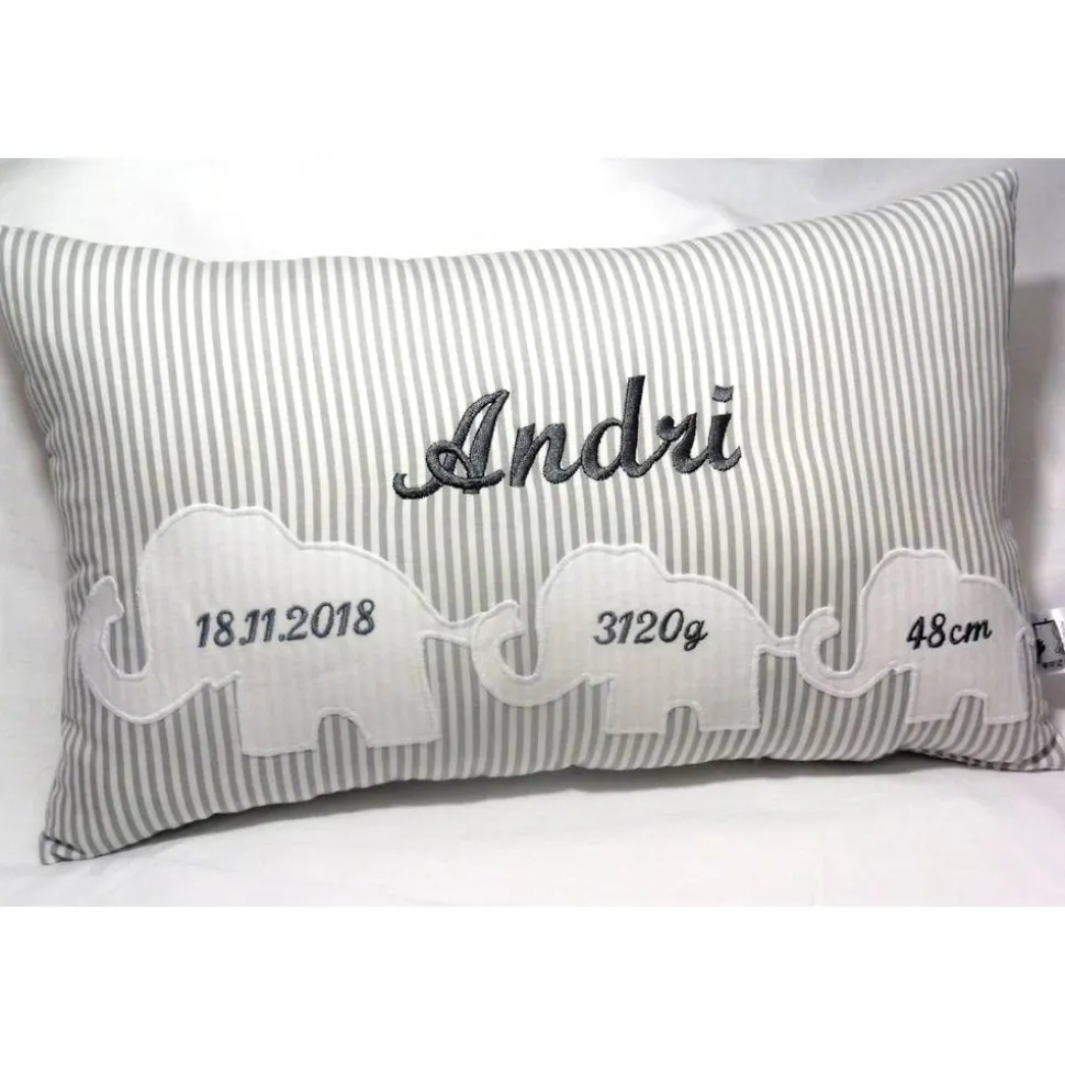 Das gemütliche Namenskissen (25cm x 40cm) aus hochwertigen Baumwollstoffen in grau/weiß gestreift mit drei süßen Elefanten sowie den Geburtsdaten des neuen Erdenbürgers ist ein wundervolles Geschenk zur Geburt oder Taufe – für Jungen und Mädchen gleichermaßen.