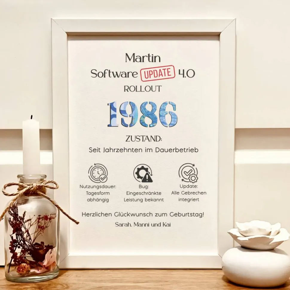 Mit dem Software Update 4.0 im IT-Design überraschst du jeden Technikfan, Programmierer oder Gamer zum runden Geburtstag. Das moderne Geschenk spielt humorvoll mit typischen Begriffen wie Update, Feature, Performance und Bug – perfekt für IT-Experten, Entwickler, junge Führungskräfte und Kollegen mit Sinn für Humor.