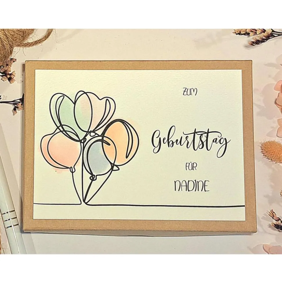 Diese hochwertige Geschenkbox aus Kraftkarton ist liebevoll mit Luftballons im modernen Oneline- und Aquarell-Stil verziert. Das Besondere: Wir personalisieren deine Geschenkbox individuell mit dem Namen des Jubilanten – so wird jedes Geldgeschenk zum unvergesslichen Highlight.