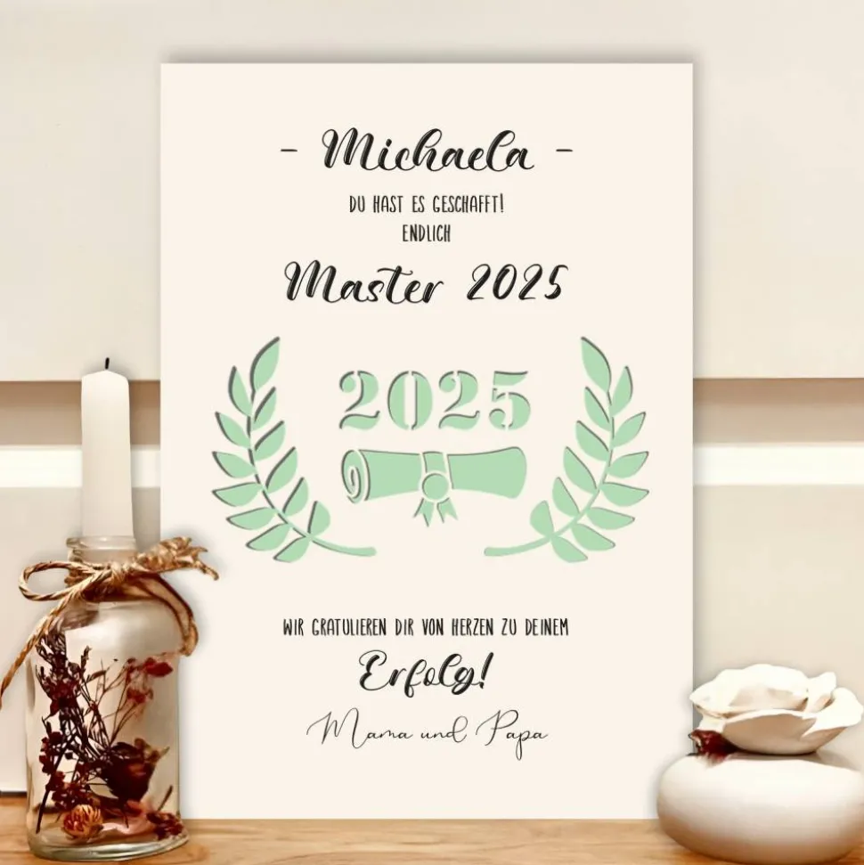 Edles Design & persönliche Note: Der elegante Blätterkranz, die integrierte Urkunde sowie der Glückwunsch-Schriftzug „Du hast es geschafft! Endlich Master“ machen das Bild zum dekorativen Hingucker. Darunter finden deine Glückwünsche Platz – so wird das Geschenk besonders herzlich und persönlich.