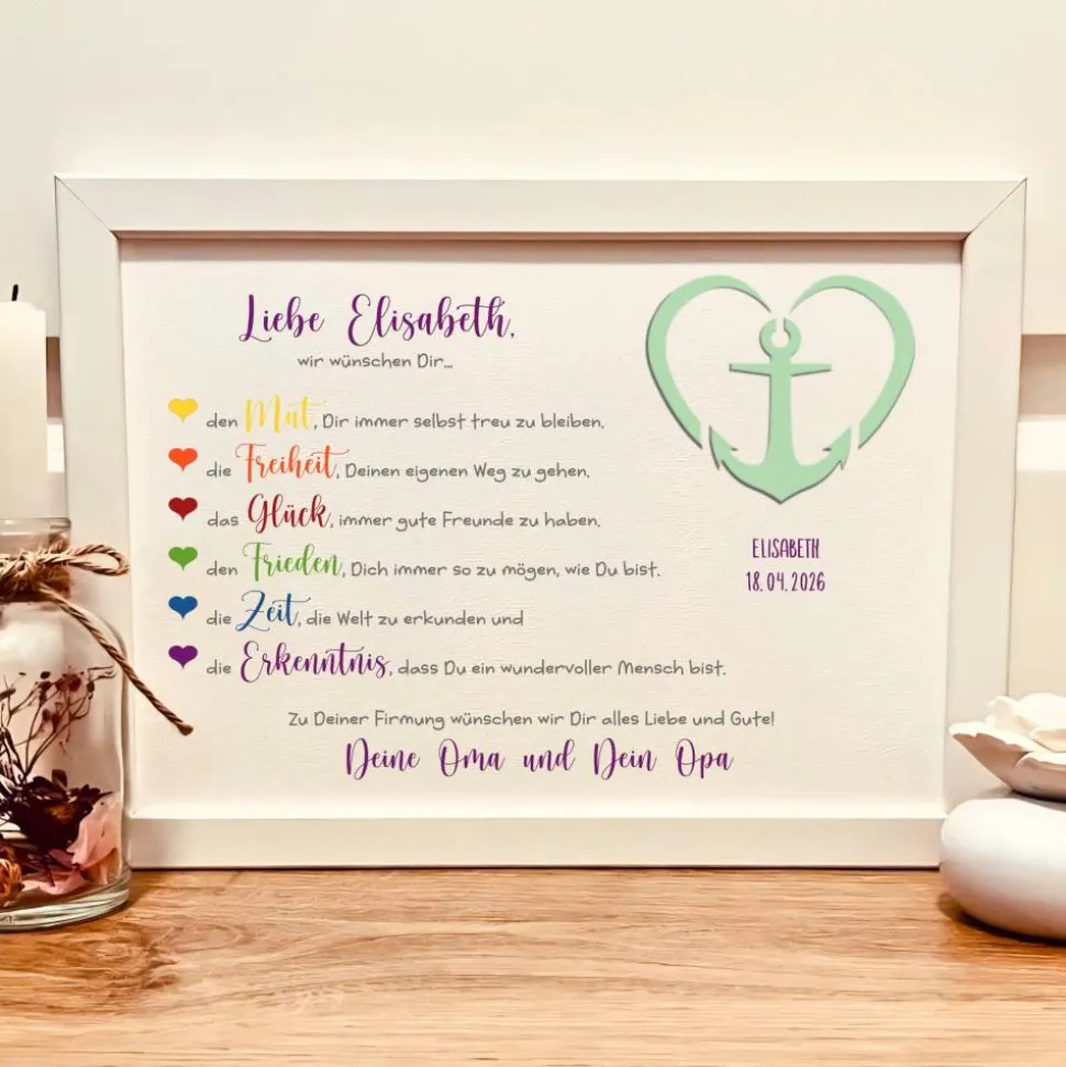 Das A4-Bild (29,7 x 21 cm) zeigt ein schönes Schnittbild eines Ankers im Herzen. Hinter diesem Motiv kannst du Geldscheine originell und ansprechend überreichen. Das Bild wird mit dem Namen des Firmanden und dem Firmungsdatum personalisiert. Zusätzlich lassen sich die Namen der schenkenden Gratulanten, wie Patentante, Patenonkel, Götti, Familie, Mama, Papa, Oma oder Opa, ergänzen – für ein ganz persönliches Geschenk.