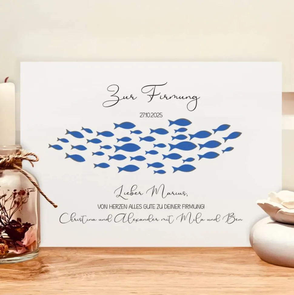Du suchst ein einzigartiges Geldgeschenk zur Firmung? Mit diesem personalisierten Geschenkbilderrahmen schenkst du Freude und Erinnerungen! Das Bild wird individuell mit dem Namen des Firmanden, dem Firmdatum sowie den Namen der Gratulanten, wie Patentante, Patenonkel, Mama, Papa oder Oma und Opa, personalisiert – für eine besonders persönliche Note.