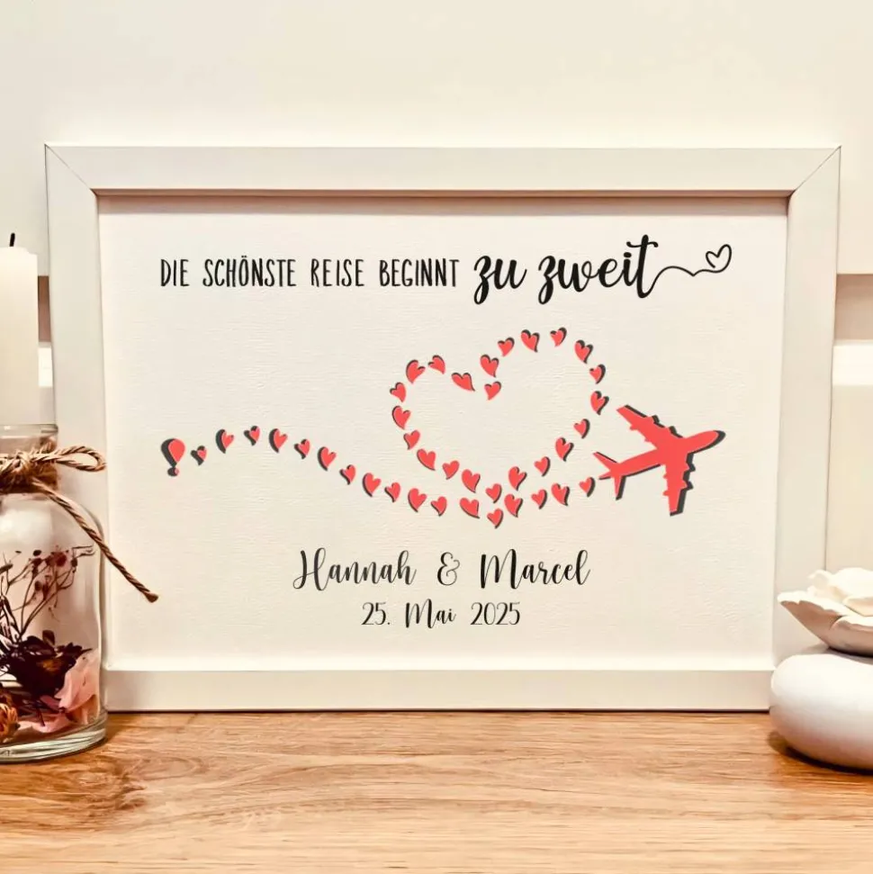 Das wunderschöne Geschenkbild im DIN A4-Format (21 x 29,7 cm) wird individuell mit den Namen des Brautpaares und dem Hochzeitsdatum gestaltet. Begleitet vom romantischen Spruch „Die schönste Reise beginnt zu zweit“ ist dieses Hochzeitsgeschenk ein emotionales Andenken und eine kreative Geldgeschenkverpackung.