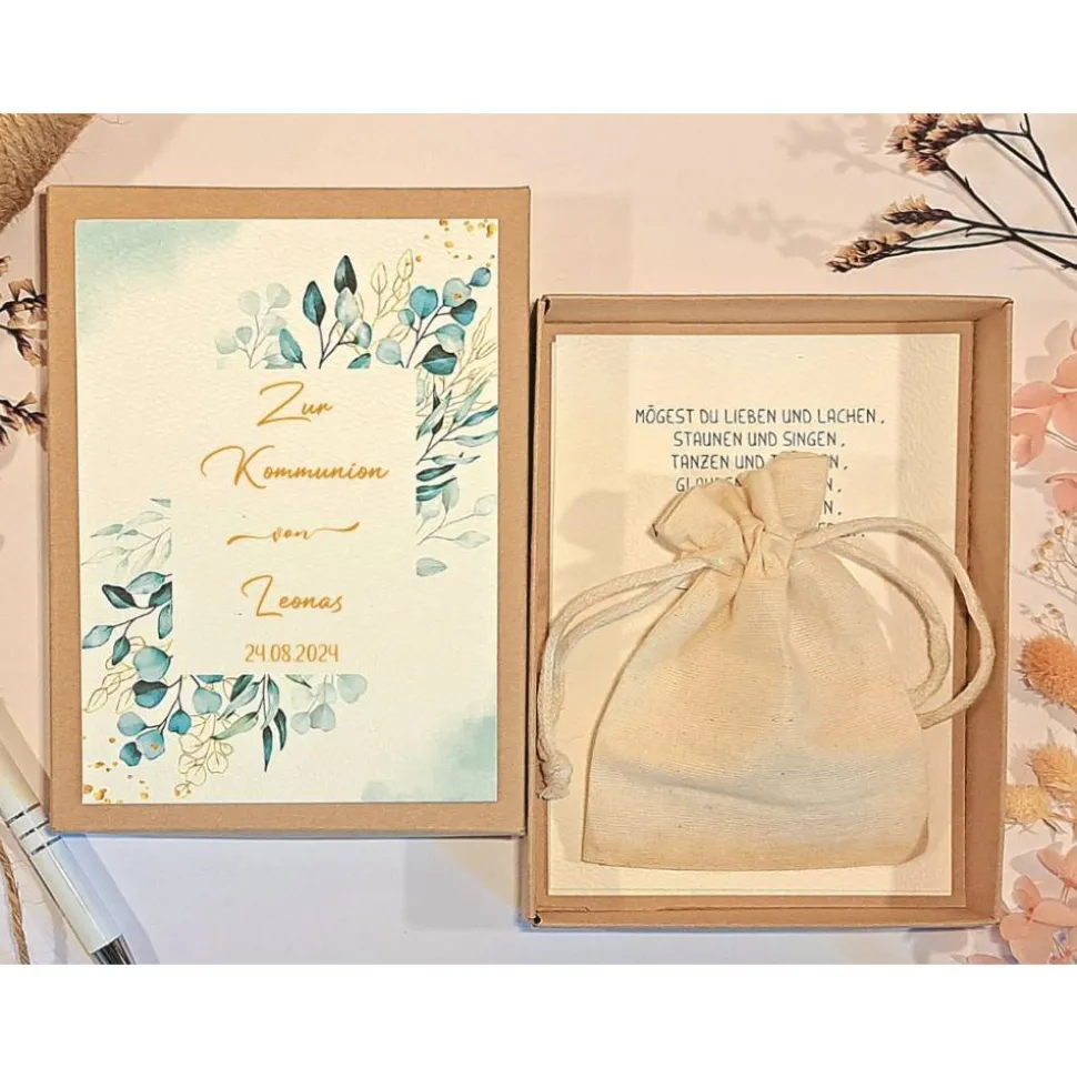 Die hochwertige Schachtel besteht aus robustem Kraftkarton und wird mit einem stilvollen Blätter-Design verziert. Die Box wird individuell mit dem Namen des Kommunionskindes und dem Datum der Kommunion personalisiert und macht dein Geschenk zum echten Highlight.