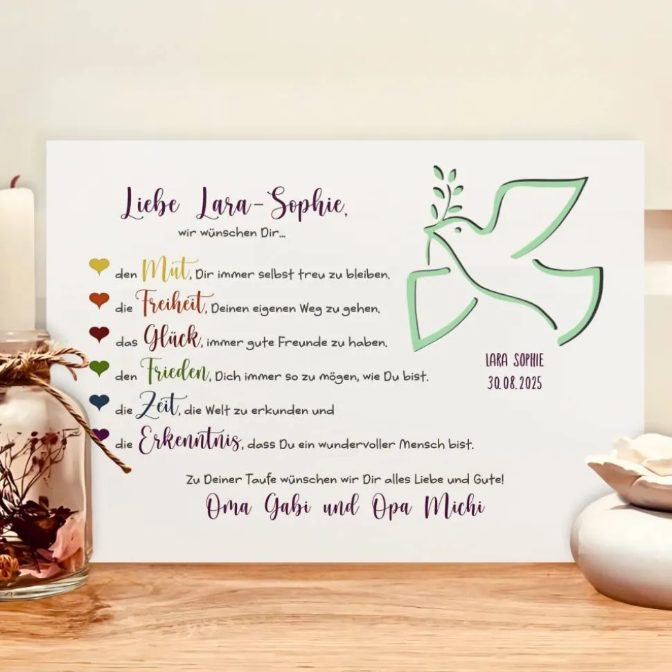 Persönliche Note: Dein Wunschname und das Taufdatum werden hochwertig auf 300g Strukturkarton gedruckt. Optional kannst du die Namen der schenkenden Gratulanten (z. B. Paten, Eltern, Großeltern) ergänzen. Herzenswünsche für den Täufling runden das Geschenk ab.