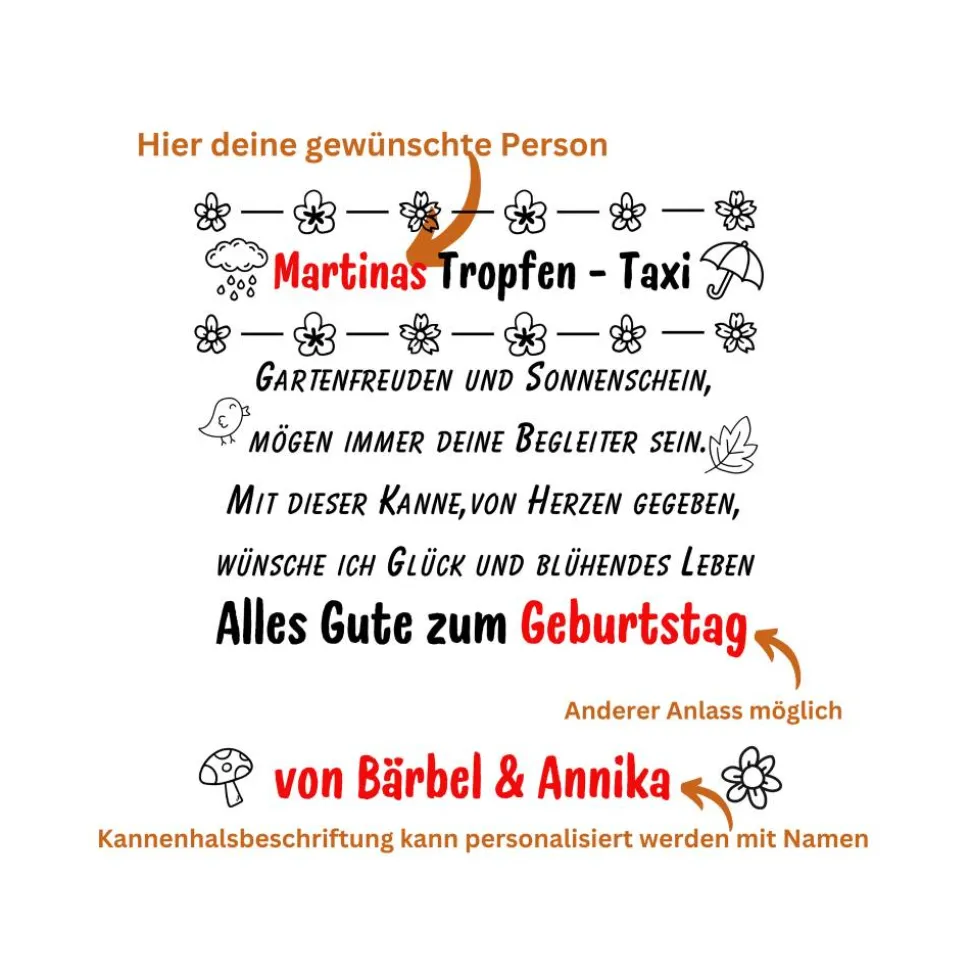 Gib gewünschten Namen für ……. Tropfen-Taxi , sowie den Anlass und den Text für den Kannenhals im Personalisierungsfeld an .