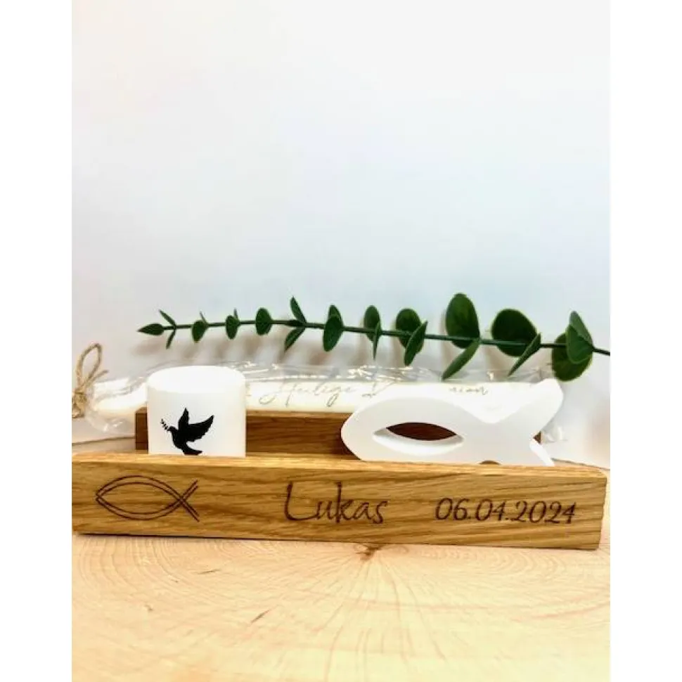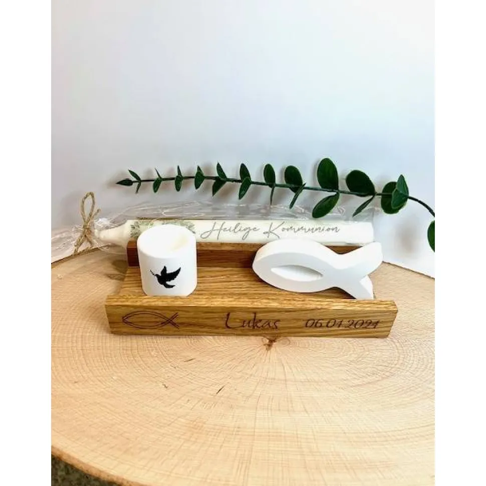 Der Holzaufsteller kann nach Wunsch mit dem Namen des Kommunionkindes und dem Datum der Kommunion graviert werden.