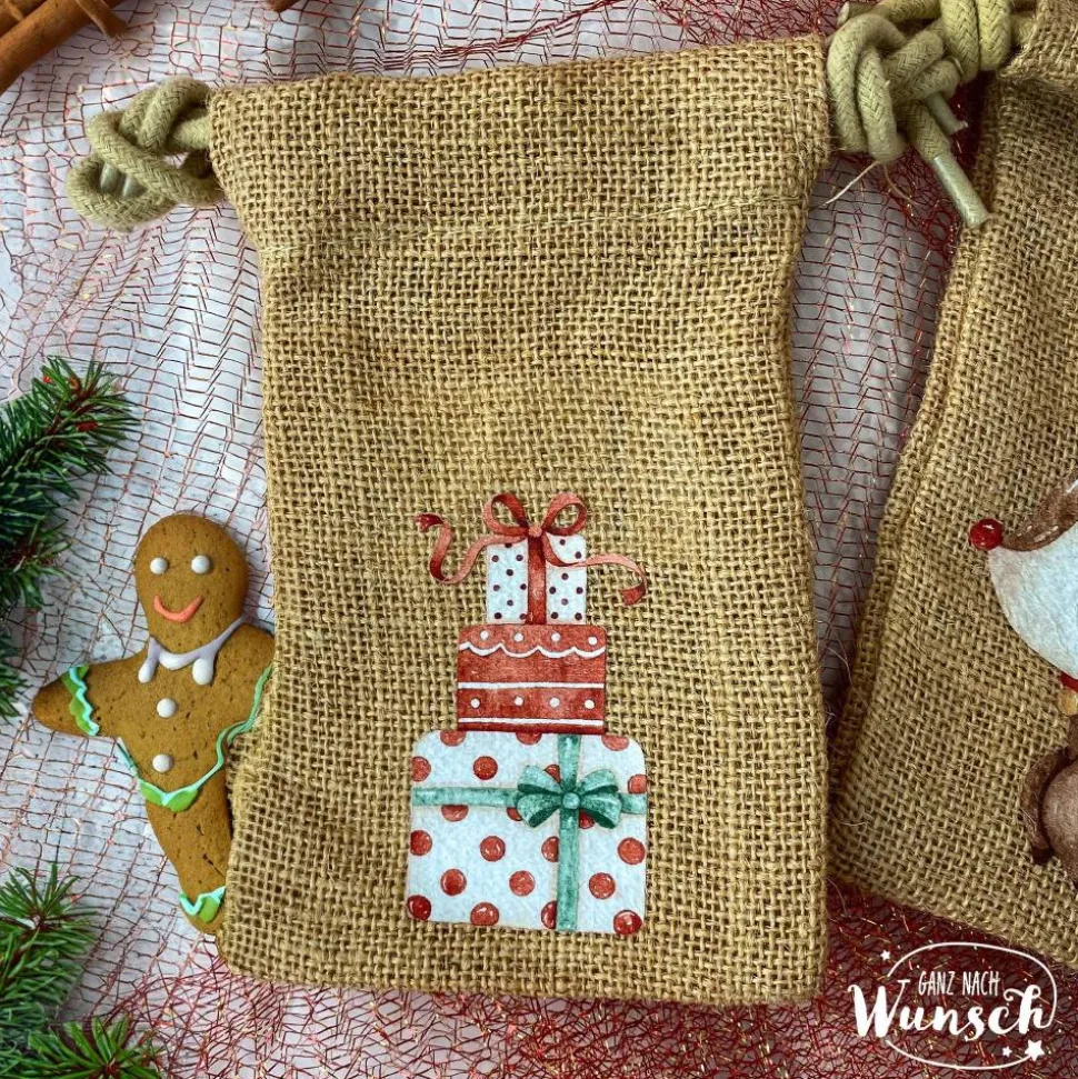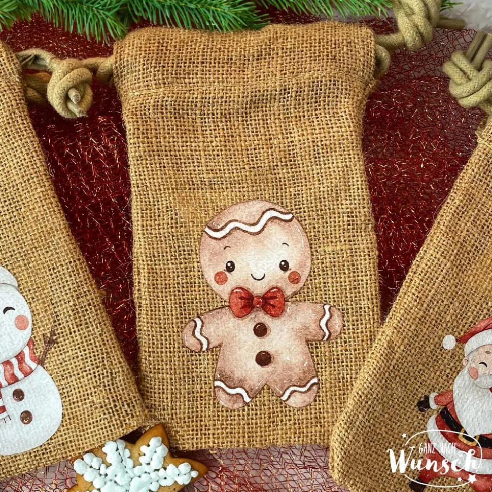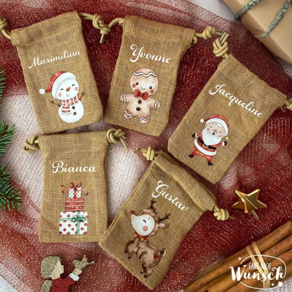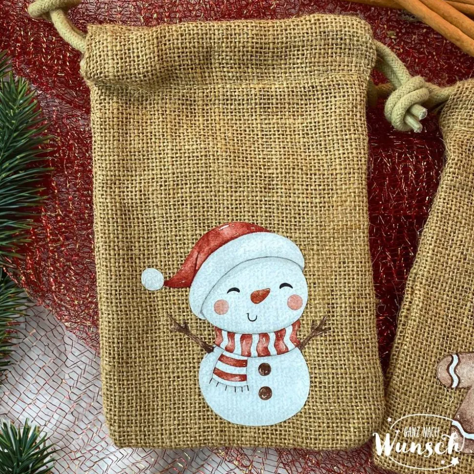 Unsere Weihnachts-Säckchen aus 100% natürlicher Jute sind nicht nur umweltfreundlich, sondern auch liebevoll gestaltet. Wähle eines der sechs verfügbaren Motive – Schneemann, Lebkuchenmann, Weihnachtsmann, Geschenke, Rentier oder Weihnachtsbaum – und lasse das Säckchen mit einem Namen personalisieren. Der doppelte Kordelzugverschluss sorgt dafür, dass die Geschenktüte sicher verschlossen bleibt, während das Material durch seine natürlichen Eigenschaften den rustikalen Charme unterstreicht.