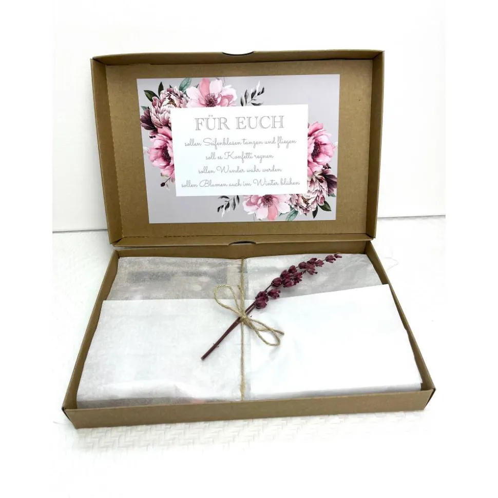Bei diesem Hochzeitsgeschenk hast du die Möglichkeit eine persönliche Nachricht für das Brautpaar im Blumendesign der Geschenkbox anfertigen zu lassen. Deine Nachricht wird in einer schönen Schreibschrift auf einer separaten Karte gedruckt und der Geschenkbox beigelegt.
