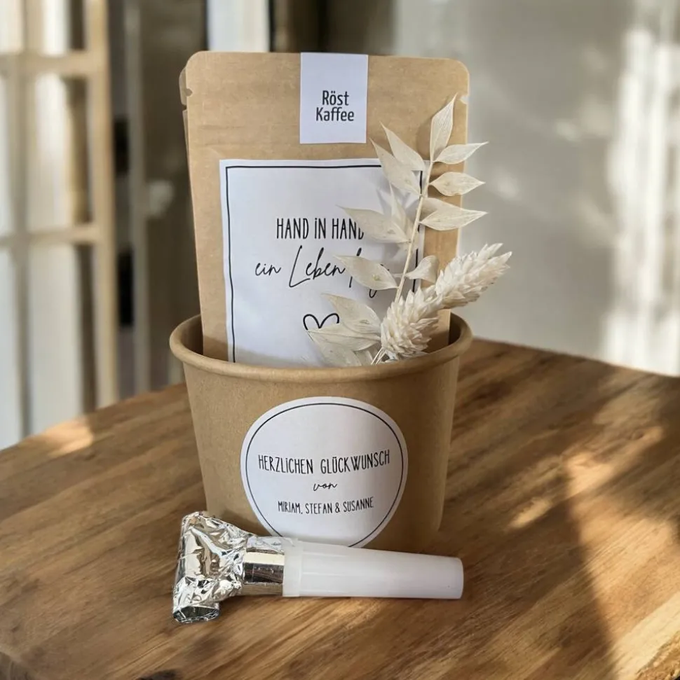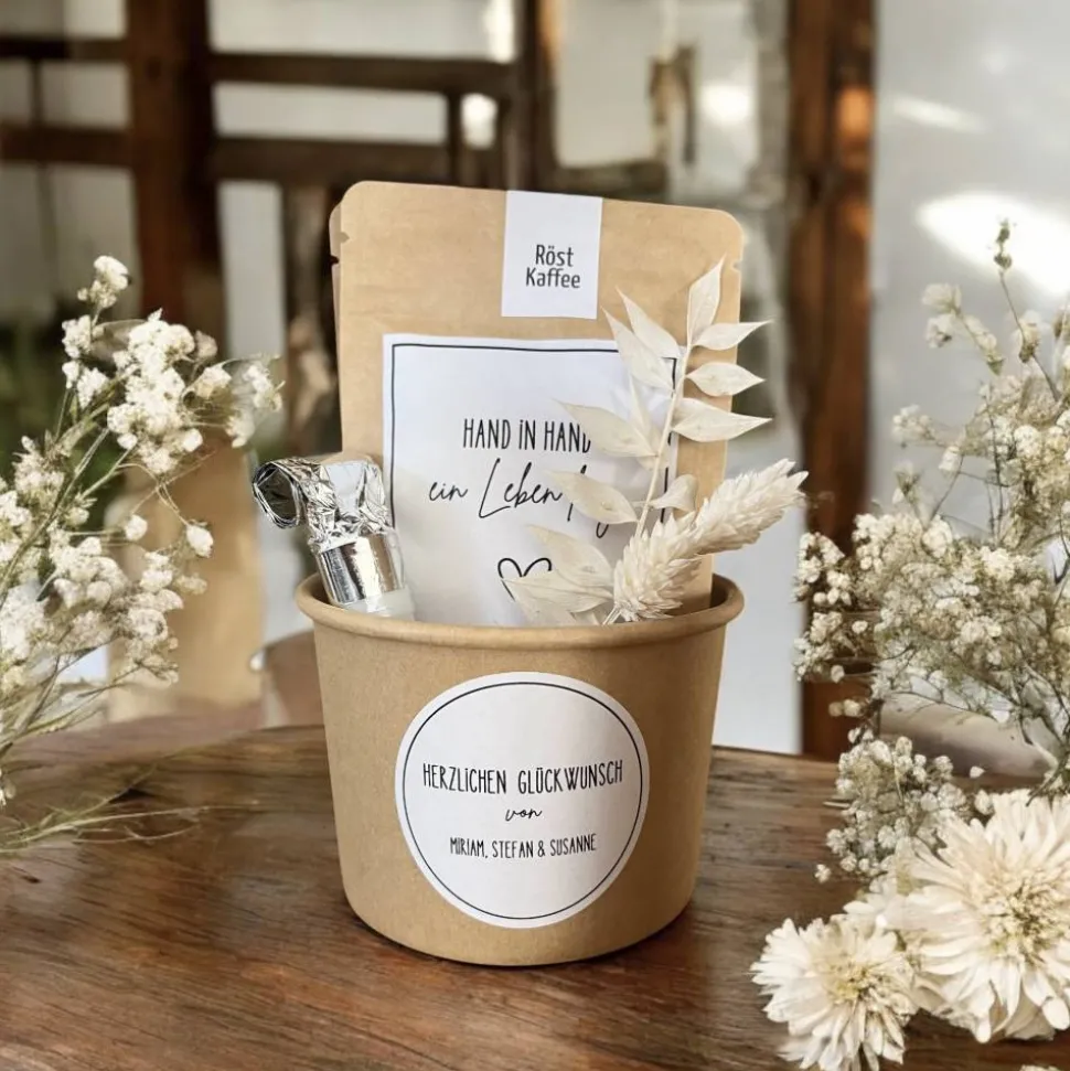 •Kraftpapierbehälter; 9,5cm (B), 6,7cm (H) mit Etikett: „Herzlichen Glückwunsch von (Name)“