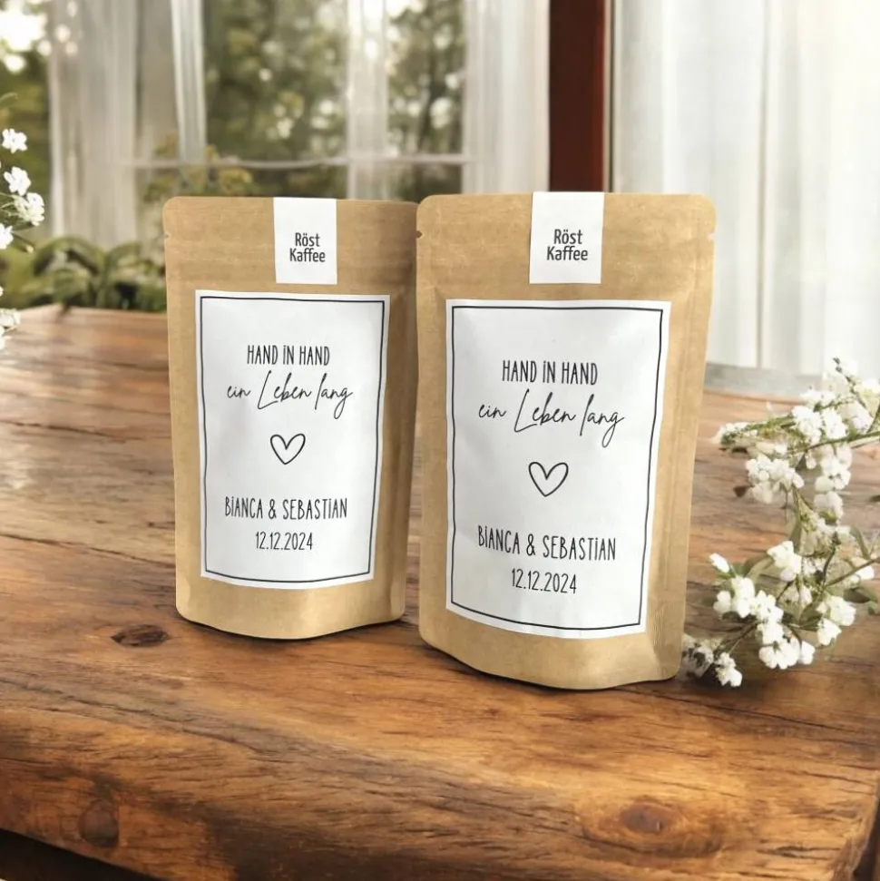 •zwei Getränk mit Etikett: „Hand in Hand ein Leben lang“ und