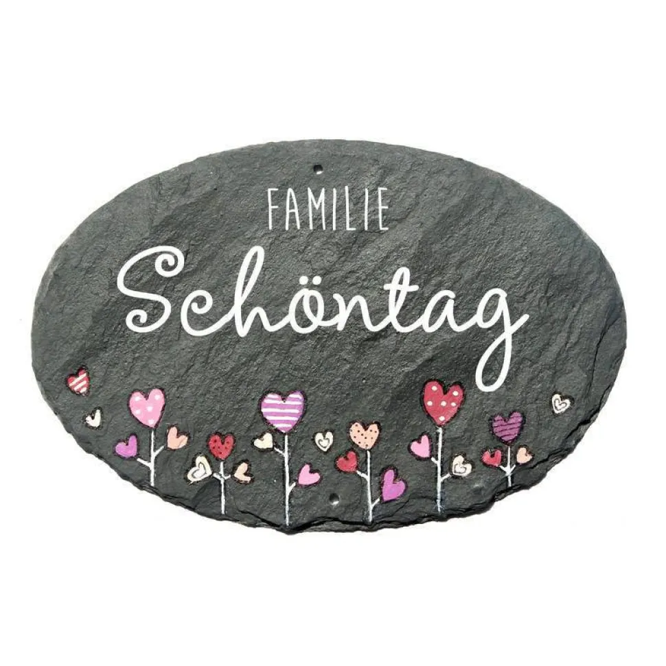 Verschenke ein einzigartiges, personalisiertes Hochzeitsgeschenk: Das ovale Türschild aus Naturschiefer mit dem Motiv „Herzblumen“ ist ein echtes Unikat für das Brautpaar – handbemalt, wetterfest und individuell mit deinem Wunschnamen gestaltet.