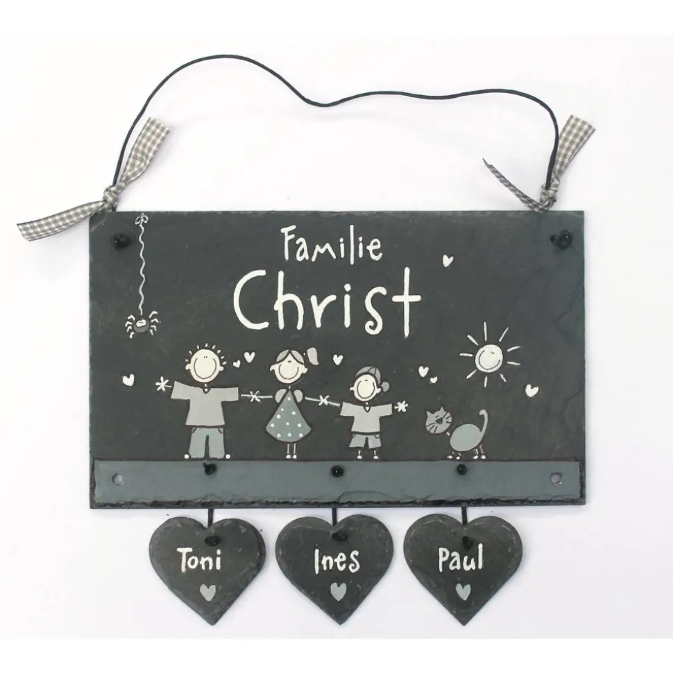 Verschenke ein einzigartiges, handgefertigtes Türschild aus Schiefer als personalisiertes Hochzeitsgeschenk für das Brautpaar! Dieses exklusive Namensschild wird individuell mit dem Familiennamen, Wunschfiguren (in Grautönen) und bis zu sechs Herzanhängern gestaltet, die mit Vornamen und einem kleinen Herz bemalt werden. Jedes Schild ist ein Unikat, das Deinem Zuhause eine persönliche Note verleiht und Gäste stilvoll empfängt.