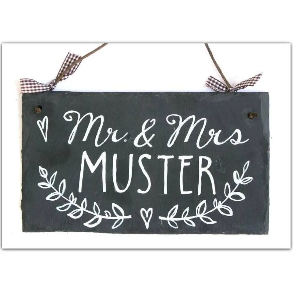 Das Schild wird mit Mr & Mrs und Nachname beschriftet, darunter eine geteilte Ranke mit Herz. Für gleichgeschlechtliche Paare ist auch die Beschriftung mit Mr & Mr oder Mrs & Mrs möglich – ganz nach Deinem Wunsch. Die Beschriftung erfolgt in Weiß und sorgt für einen modernen, zeitlos eleganten Look.