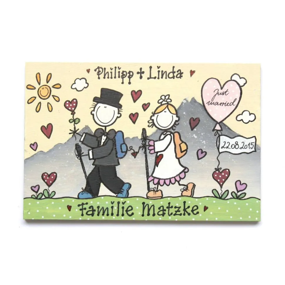 Deine Personalisierungsmöglichkeiten: Gib uns einfach eure Vornamen, den zukünftigen Familiennamen, besondere Merkmale wie Haarfarbe oder Brille sowie das Hochzeitsdatum an. Die gewünschte Schriftart kannst du anhand der Auswahltabelle bei den Produktfotos bestimmen. Jedes Holzschild ist ein handgemachtes Unikat – kleine Abweichungen in der Bemalung machen dein Geschenk besonders individuell.