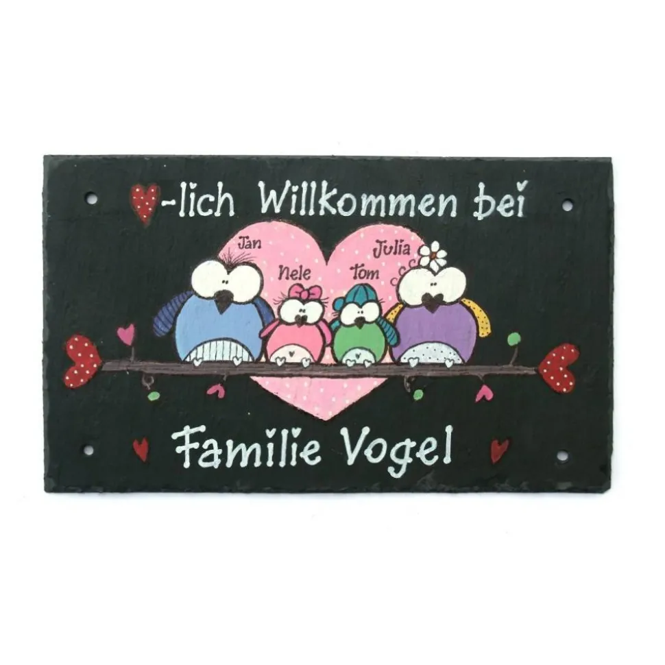 Exklusives Design: Das wetterfeste Türschild aus Naturschiefer wird oben in deiner Wunschschriftart mit „-lich Willkommen bei“ und unten mit „Familie“ sowie dem Nachnamen beschriftet. Die liebevoll gemalte Eulenfamilie auf einem Ast – bestehend aus zwei Elterneulen und bis zu zwei Kindereulen – wird von einem Herz im Hintergrund umrahmt. Auf Wunsch werden die Vornamen zu den einzelnen Eulen geschrieben. Auch rein für zwei Erwachseneneulen gestaltbar!