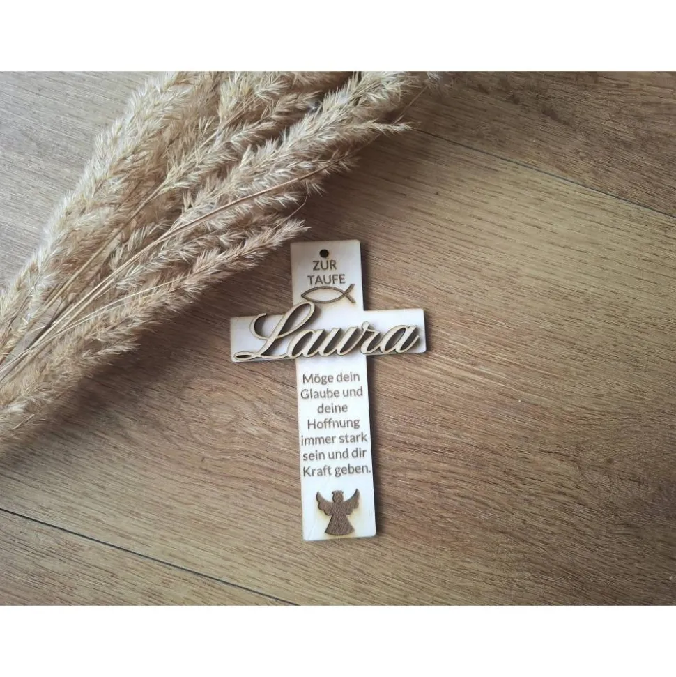 Dieses liebevoll gestaltete Holzkreuz ist ein einzigartiges Geschenk, das bleibt. Verwendet zur Verzierung eines Geschenks, kann es auch danach noch als Dekoration im Kinderzimmer aufgehangen werden. Auch als Tischdekoration geeignet. Gefertigt aus hochwertigem Holz und mit einem aufgesetzten Namenszug in 3D-Optik versehen, wird jedes Kreuz zu einem ganz persönlichen Erinnerungsstück.