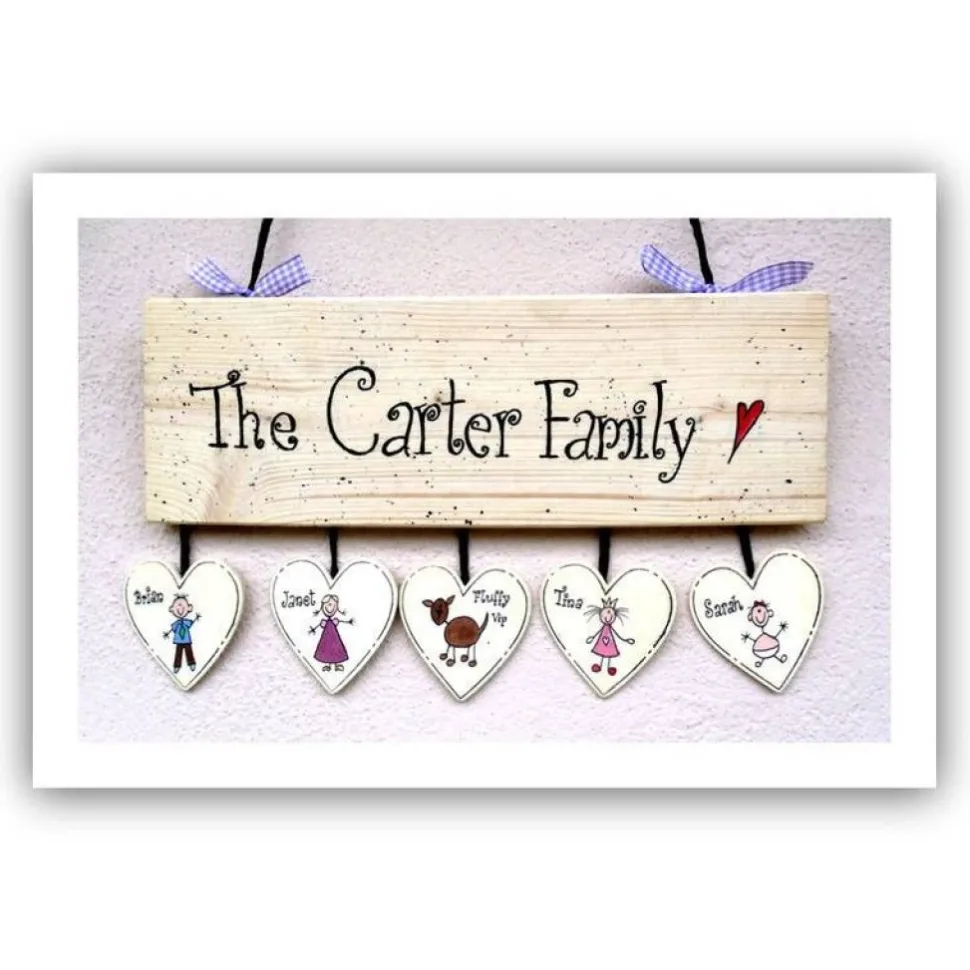 Du kannst dein Schild mit dem Wunschtext entweder mit „The (Name) Family“ oder „Familie“ und Nachname in deiner Lieblingsschrift gestalten lassen. Bis zu sechs weiße Herzanhänger werden mit Wunschfigur und Vornamen personalisiert – perfekt als Symbol für jedes Familienmitglied.