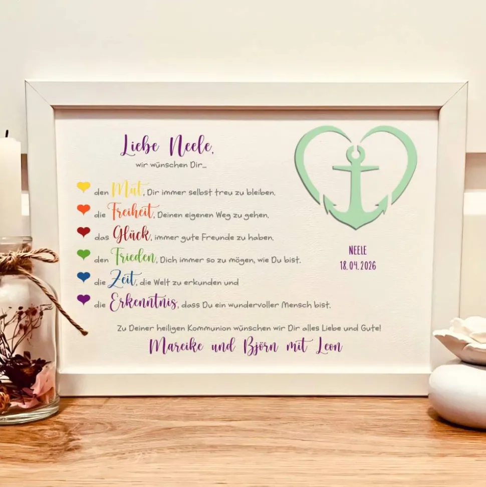 Deine individuelle Note: Du bestimmst den Namen des Kommunionkindes, das Datum der Erstkommunion und auf Wunsch die Namen der Schenkenden. Jedes Bild wird speziell für dich nach deinen Vorgaben gestaltet und optional im weißen DIN A4 Rahmen (21 × 29,7 cm) geliefert.