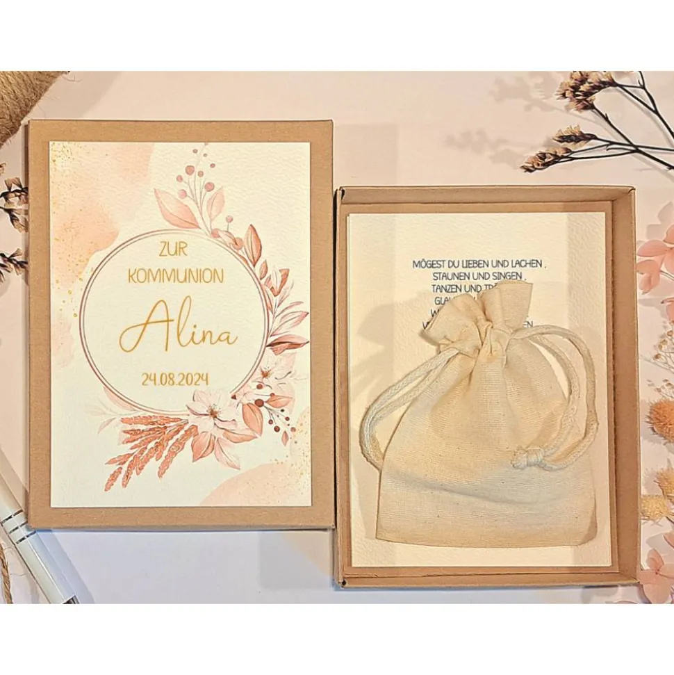 Mit dieser liebevoll gestalteten Geschenkbox zur Kommunion zauberst du ein Lächeln auf das Gesicht des Kommunionskindes. Die hochwertige Schachtel aus Kraftkarton überzeugt mit einem floralen Motiv und wird individuell mit dem Namen und dem Datum der Kommunion personalisiert.