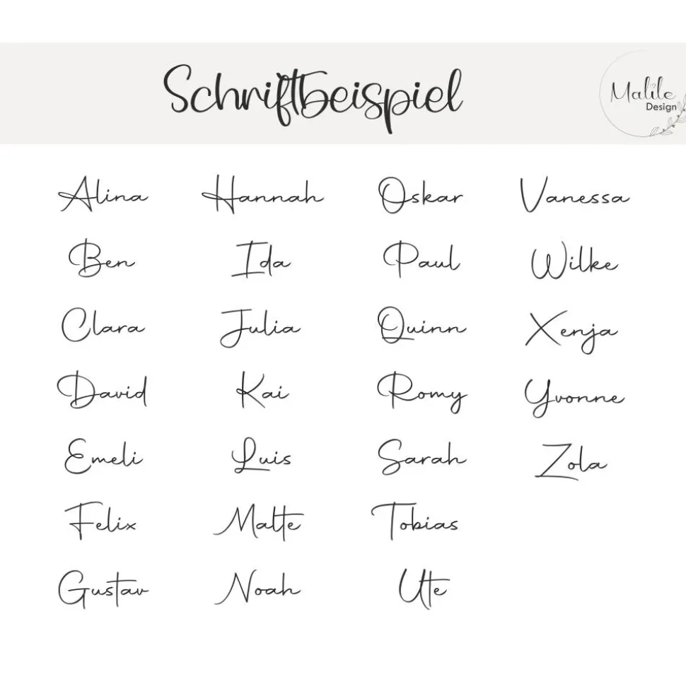 Unter den Varianten kannst du zwischen 40 verschiedenen Schriftfarben wählen. Sieh dir dazu gerne die Beispiele in der Bildergalerie an. Die Schriftgröße ist abhängig von dem Wunschnamen. Je nach länger kann er größer oder kleiner ausfallen.