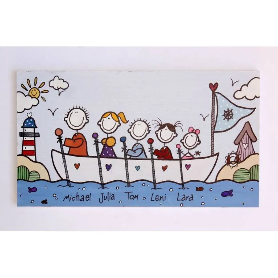 Verschenke ein einzigartiges, handbemaltes Türschild aus Holz mit maritimem Motiv und Boot! Dieses personalisierte Familienschild wird individuell mit euren Wunschfiguren und Namen gestaltet. Oben steht euer Familienname in deiner gewählten Schriftart, die Figuren sitzen gemeinsam im Boot, darunter werden eure Vornamen ins Wasser geschrieben. Mit einer Aufhängekordel ausgestattet, ist das Schild ein echter Blickfang für die Haustür und eignet sich perfekt als Geschenk zum Einzug, Umzug, Richtfest oder zur Einweihungsparty.