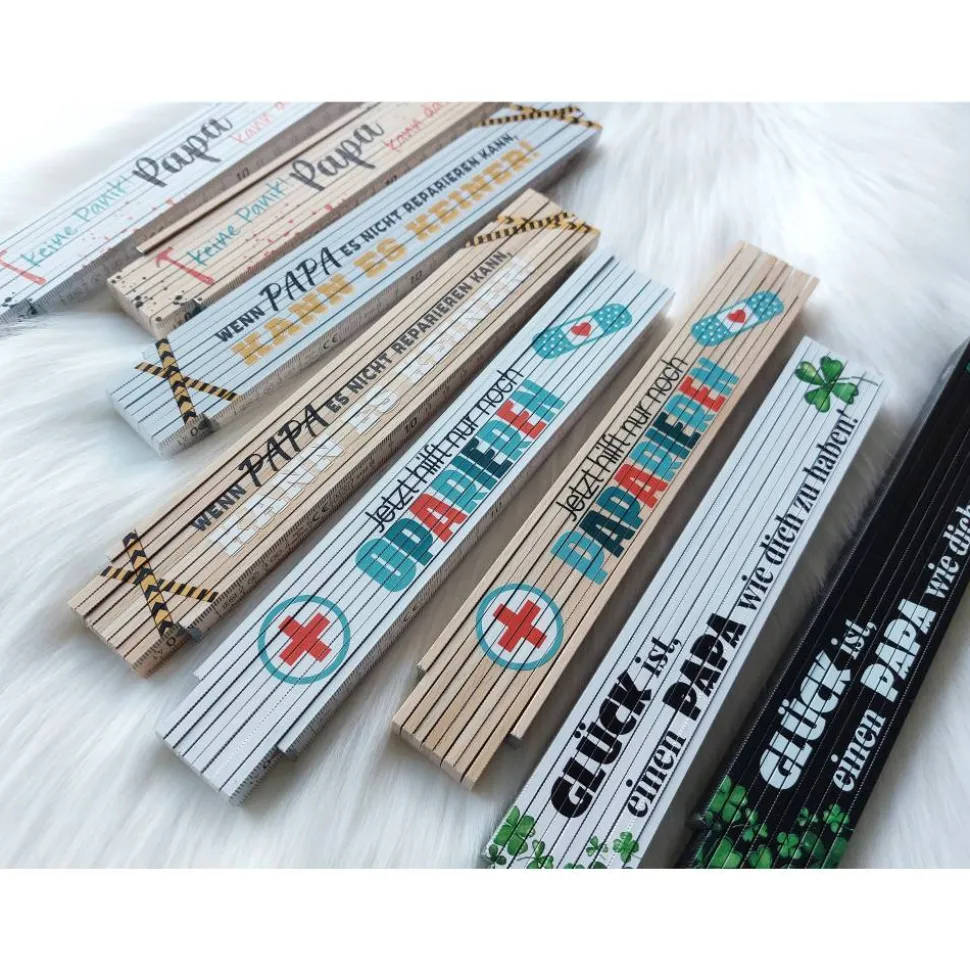 Lieferumfang: Ein 2m Zollstock in deiner Wunschfarbe mit individuellem Aufdruck (Motiv 1/2/3/4) und Name nach Wahl. Teile einfach Papa, Opa, Fritz oder deinen Wunschnamen mit.