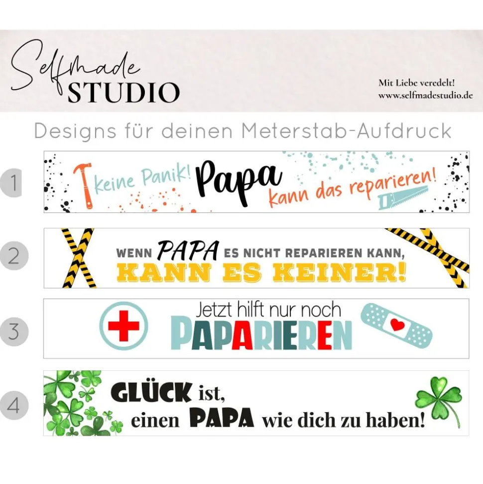 Der Meterstab wird einseitig bedruckt und ist das perfekte Präsent für Vatertag, Geburtstag oder einfach als kleine Aufmerksamkeit für Handwerker und Bastler. Wähle zwischen kreativen Sprüchen wie „Keine Panik! Helmut kann das Reparieren!“, „Wenn Fritz es nicht reparieren kann, kann es keiner!“ oder gebe deinen eigenen Namen an. So entsteht ein ganz persönliches Geschenk, das in keiner Werkzeugkiste fehlen darf.