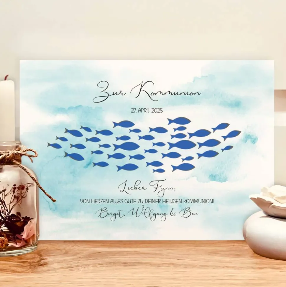 Das Bild wird individuell für Dich gestaltet – auf hochwertigem 300 g/m² Strukturkarton im Format A4 (21 × 29,7 cm). Ein edler blauer Hintergrund sorgt für eine elegante Optik, die sowohl Jungen als auch Mädchen begeistert. Optional kannst Du die Namen der Gratulanten ergänzen und das Geschenk damit noch persönlicher machen.