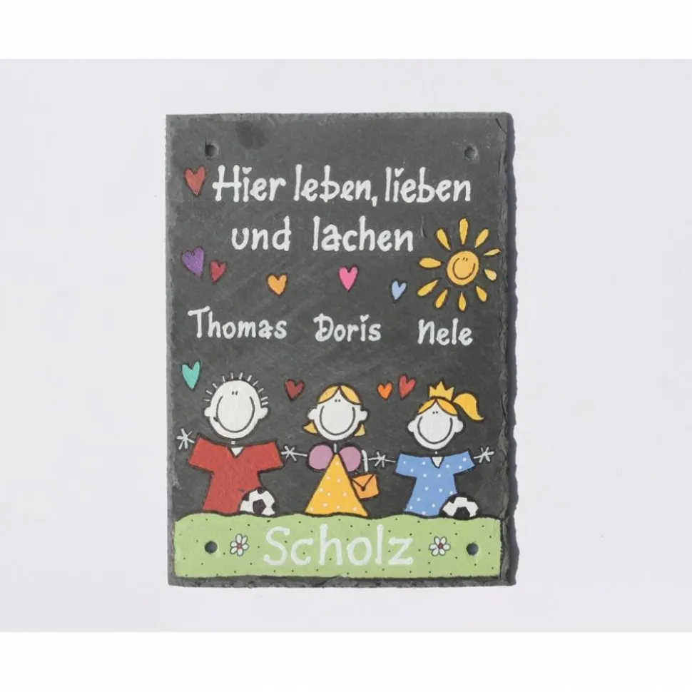 Verleihe deinem Eingangsbereich eine persönliche und stilvolle Note mit einem individuell gestalteten Türschild aus hochwertigem Schiefer. Dieses handgemachte Schiefertürschild wird exklusiv mit deinem Wunschtext und bis zu drei Vornamen personalisiert und mit liebevoll bemalten Figuren versehen. So entsteht ein echtes Unikat, das deinen Hauseingang zu einem besonderen Blickfang macht.