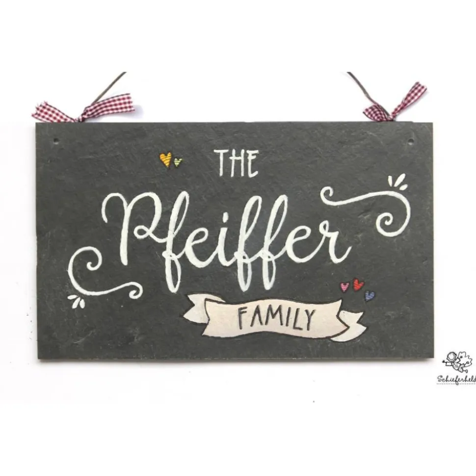 Das robuste, pflegeleichte und wetterfeste Schieferschild hat die Maße 15 x 25 – 30 cm (je nach Namenslänge). Du kannst wählen, ob du das Schild mit Aufhängekordel oder mit 4 Bohrungen zur Wandmontage erhalten möchtest. Die Beschriftung erfolgt in Weiß, während Banner und Herzen farbig gestaltet sind. Oben steht „THE“, darunter der Name in deiner Wunschschriftart und im Banner „FAMILY“.