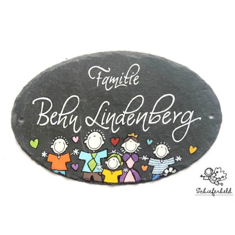 Entdecke ein einzigartiges, personalisiertes Schieferschild für Deine Familie! Dieses ovale Haustürschild aus Naturstein wird individuell mit Deinem Wunschnamen und Wunschfiguren gestaltet. Handgefertigt aus echtem Naturschiefer, ist es wetterfest, hochwertig verarbeitet und ein eleganter Blickfang für Deinen Eingangsbereich.