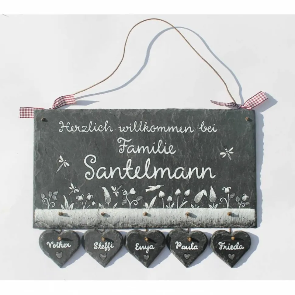 Der edle Schiefer zeichnet sich durch seine Robustheit, Pflegeleichtigkeit und Langlebigkeit aus. Das handgefertigte Familienschild überzeugt durch Natürlichkeit und ist zudem ein zeitloses, umweltfreundliches und nachhaltiges Produkt. Die dekorative Schieferplatte eignet sich hervorragend als individuelles Einzugsgeschenk für die erste gemeinsame Wohnung oder das neue Haus.