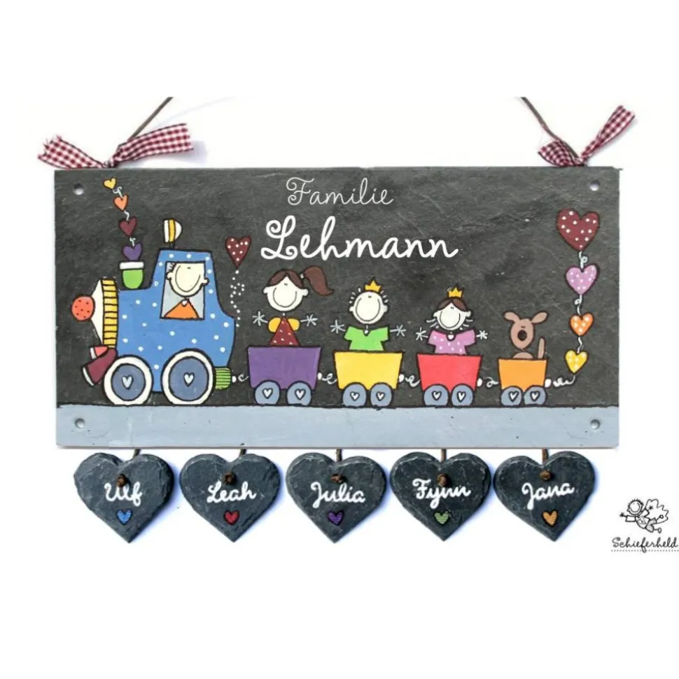 Dieses exklusive Familienschild aus Naturschiefer ist ein echter Blickfang für deinen Hauseingang. Jedes Türschild wird mit deinem Familiennamen sowie den Vornamen aller Familienmitglieder versehen. Die blaue Lokomotive und bis zu fünf bunte Waggons werden liebevoll per Hand bemalt und mit Figuren nach deiner Wahl aus der Auswahltabelle gestaltet. Herzanhänger aus Schiefer mit Vornamen machen dein Schild noch persönlicher.