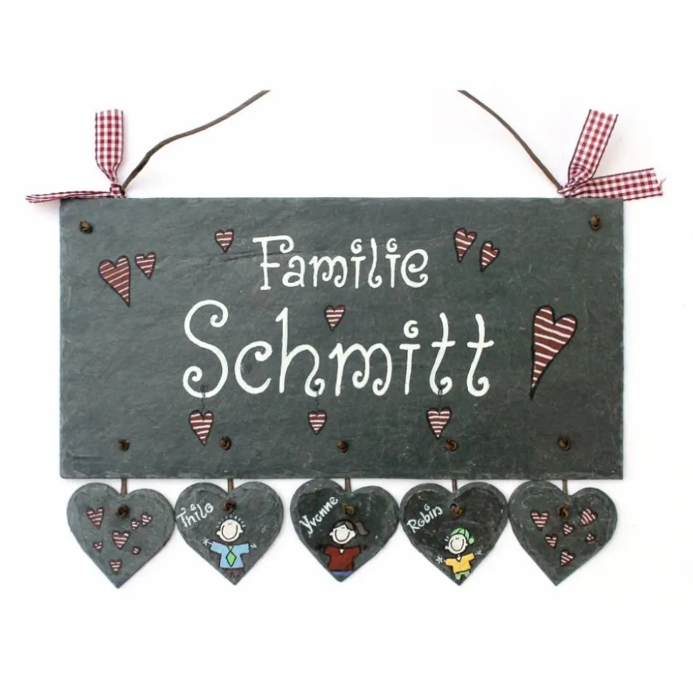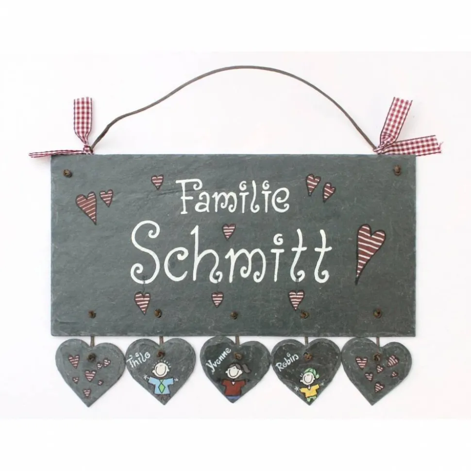 Technische Details: Das Türschild ist robust, pflegeleicht und langlebig. Es besteht aus Naturschiefer und wird zweizeilig mit „Familie“ und Nachname in deiner Wunschschriftart beschriftet. Die handbemalten, weinroten Herzen (andere Farben möglich) machen das Schild individuell. Du erhältst 3 bis 6 Herzanhänger aus Schiefer in Herzform, die mit Vornamen und Wunschfigur personalisiert werden.